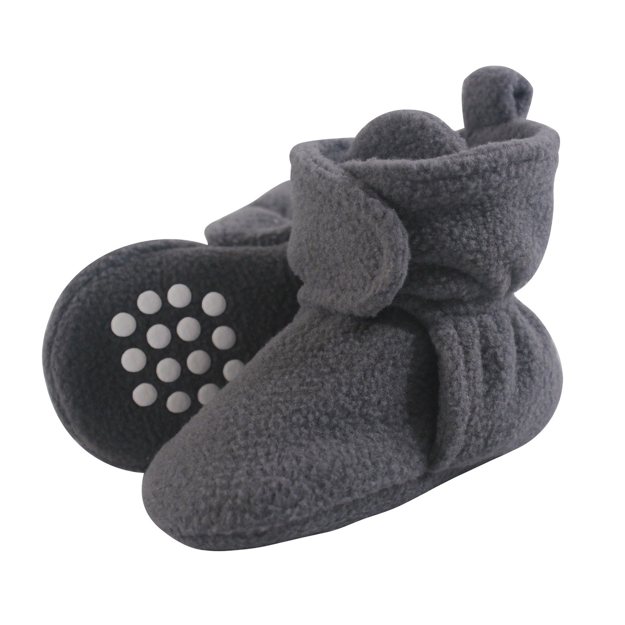 Luvable Friends fleece booties are comfortable, cozy baby booties made with fleece material that will keep your little one's feet warm and comfortable. Our booties wrap around your baby's foot and fasten in the front with a velcro closure, so they are easy to put on, fasten and stay on. Our fleece booties feature non-skid soles to prevent your baby from slipping and falling when they start to walk and run.