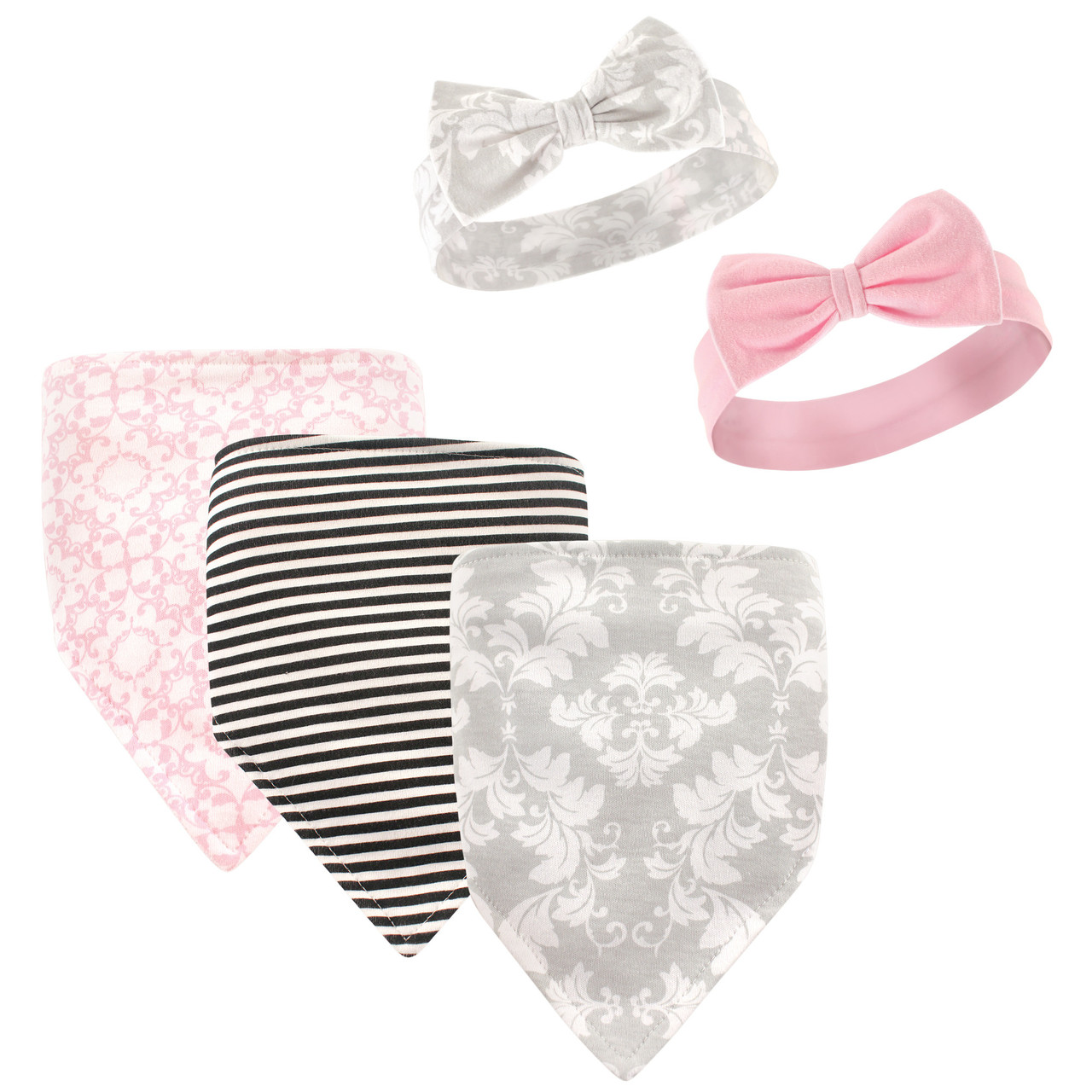 Hudson Baby Cotton Bib and Headband or Caps Set, Damask