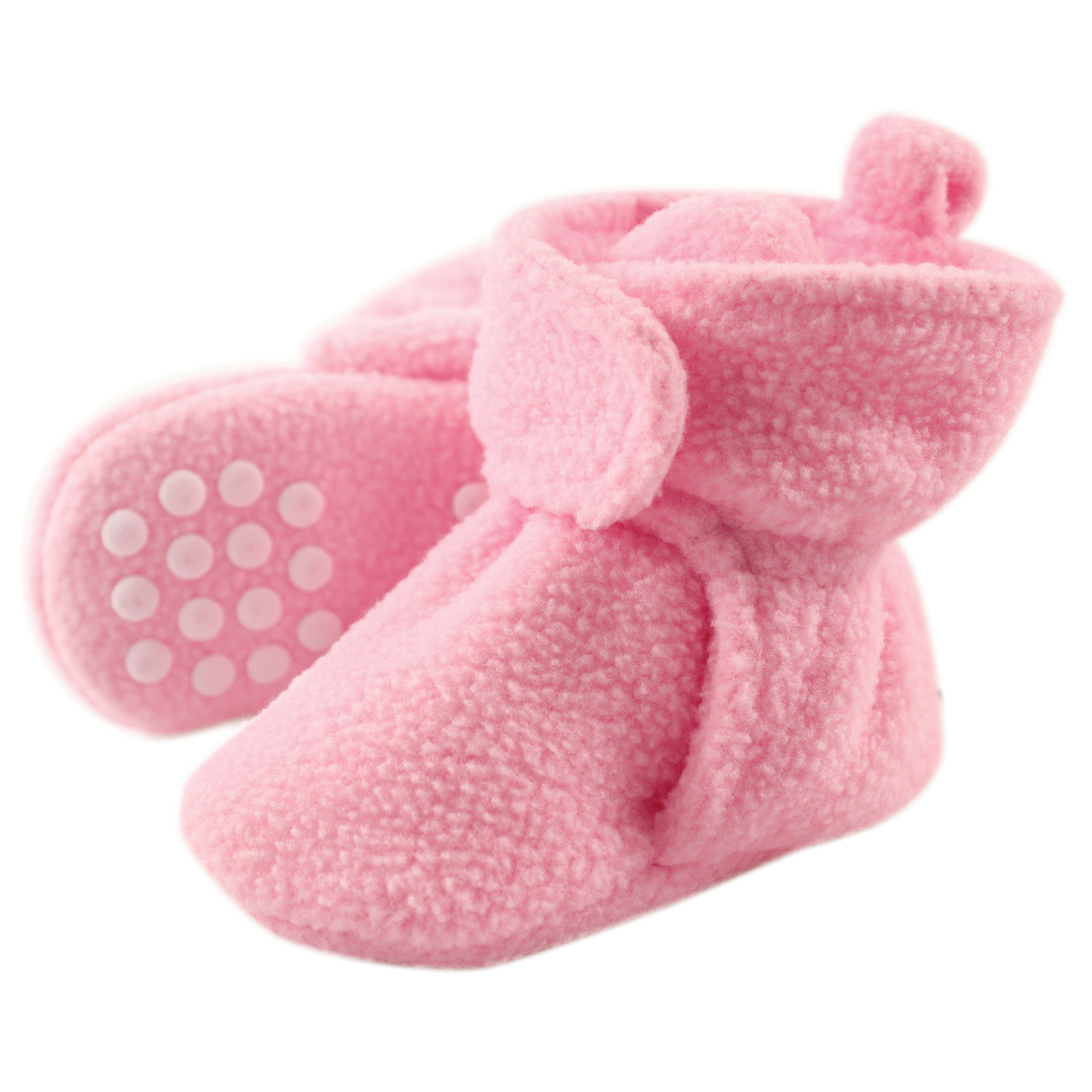Luvable Friends fleece booties are comfortable, cozy baby booties made with fleece material that will keep your little one's feet warm and comfortable. Our booties wrap around your baby's foot and fasten in the front with a velcro closure, so they are easy to put on, fasten and stay on. Our fleece booties feature non-skid soles to prevent your baby from slipping and falling when they start to walk and run.
