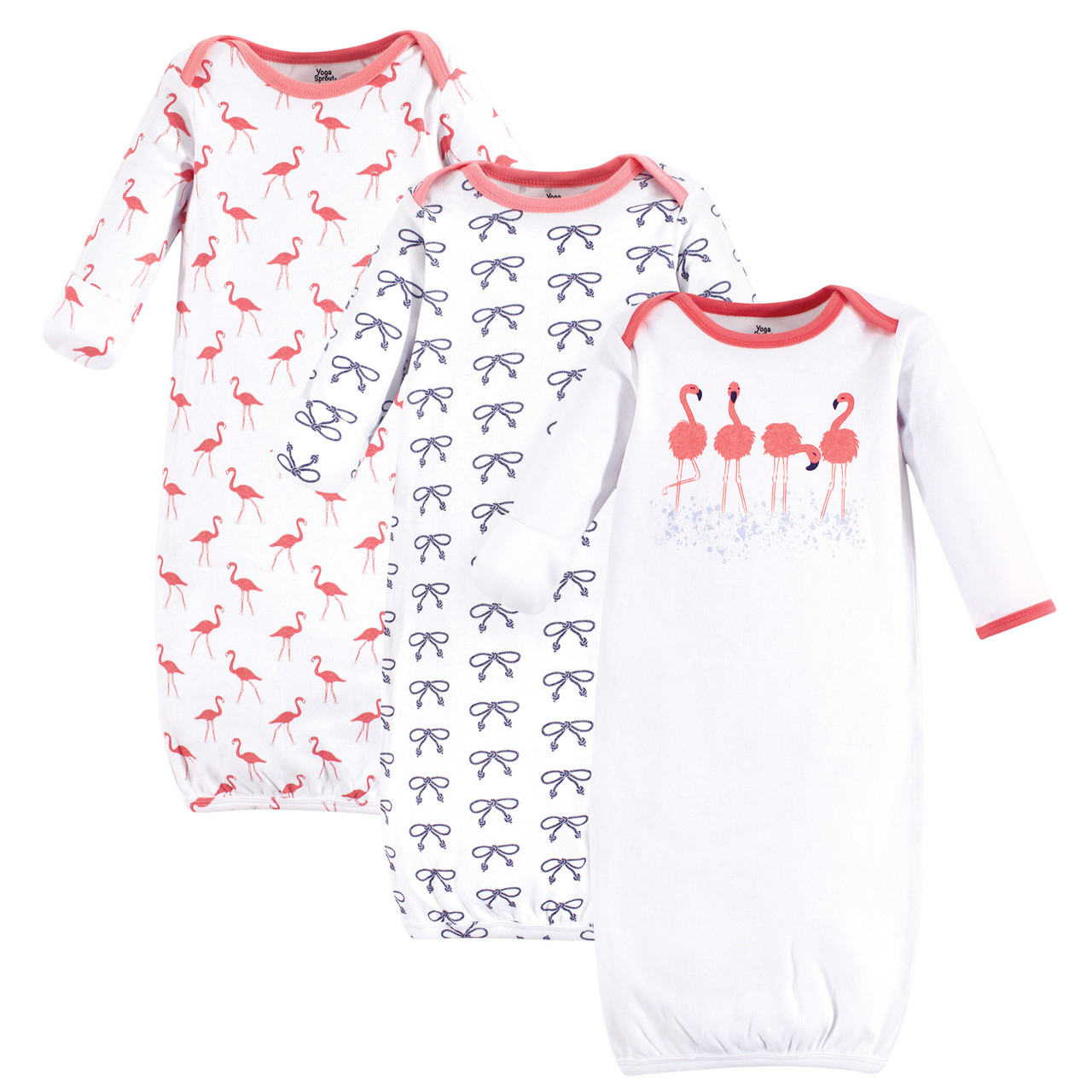 Yoga Sprout cotton gowns are super comfortable and cozy and feature playful patterns for sweet dreams. An elastic band at the bottom and a lap neck make dressing and diaper changes simple. Based on customer feedback, we would like to share size recommendations for you. Our preemie gowns are suitable for preemies and newborns from 6 to 9 pounds. Our 0-6 month gowns run a bit larger so they can last you up until your baby turns 6 months old. Our gowns are made of 100% cotton, so some shrinking should be expected.