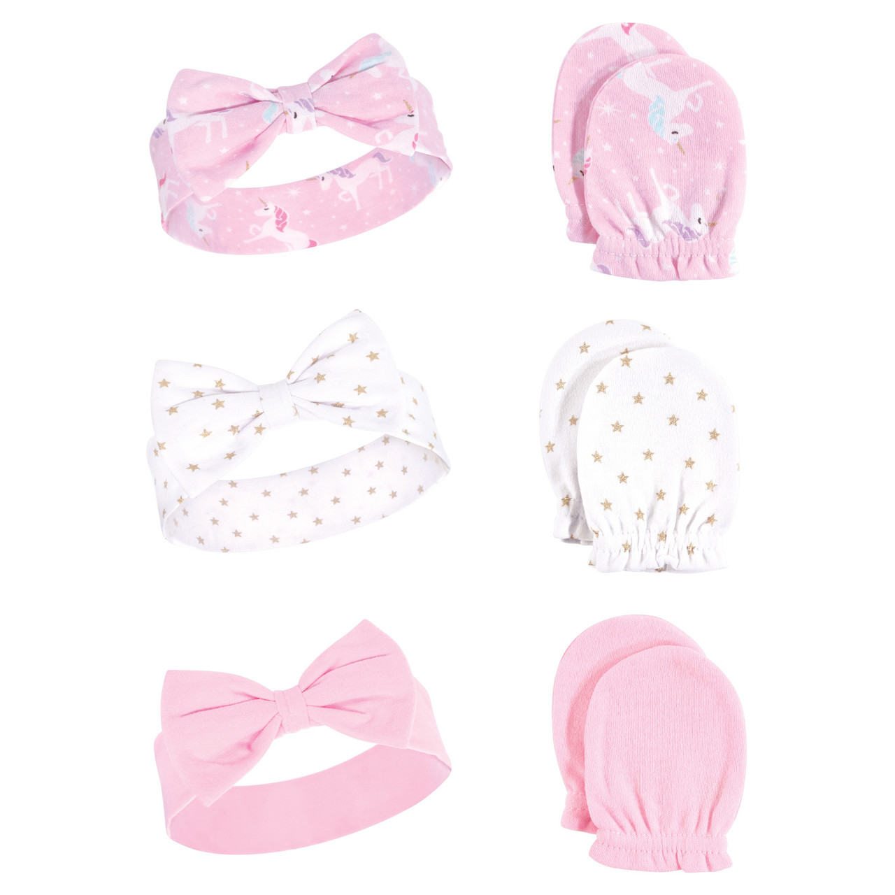 Hudson Baby headband and scratch mitten set is a perfect accessory set for your little girl. Each set comes with coordinating headbands and scratch mittens. Our headbands are a fun headwrap for your baby girl to look stylish with our adorable prints. Our scratch mittens are made with super soft cotton fabric and an elastic band around the wrist so the mittens stay on and protect your little one's face and body from any accidental scratches.
