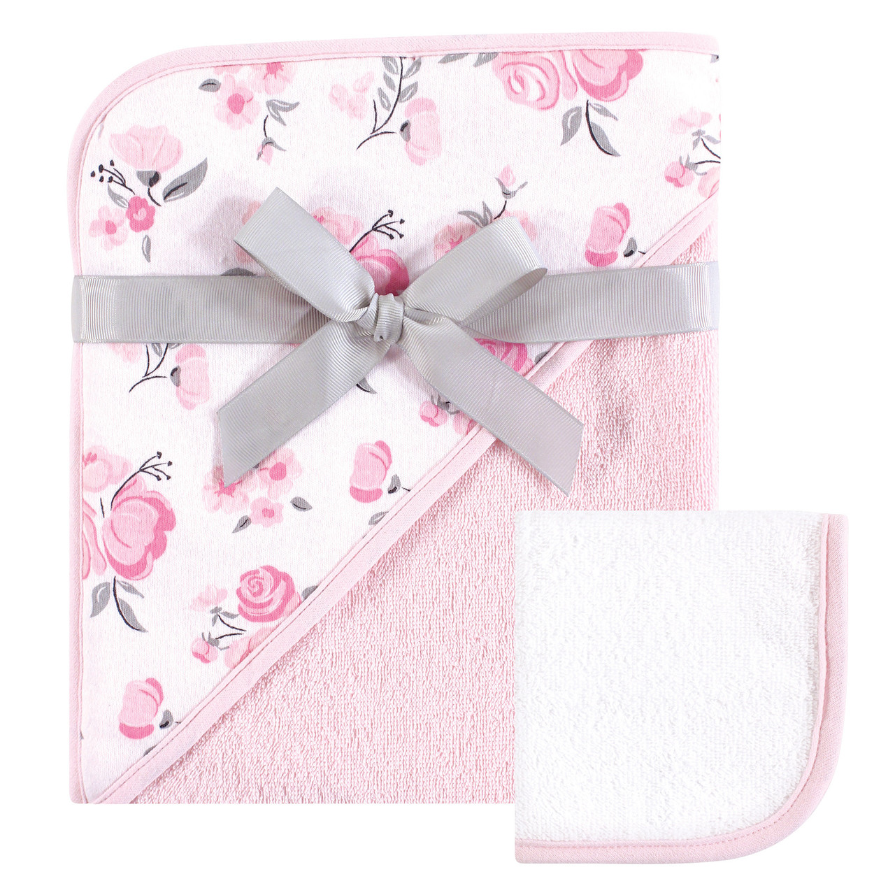 Hudson Baby Cotton Hooded Towel and Washcloth, Pink Floral