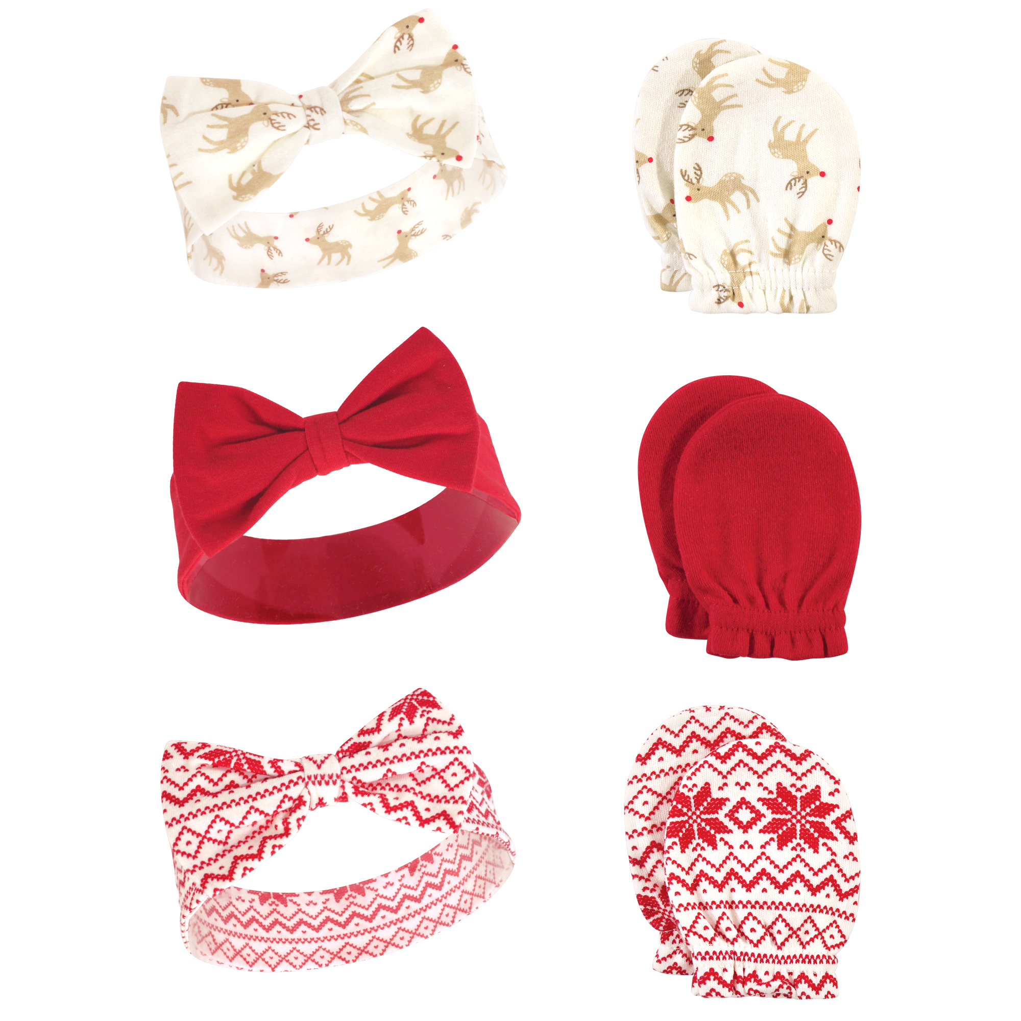 Hudson Baby headband and scratch mitten set is a perfect accessory set for your little girl. Each set comes with coordinating headbands and scratch mittens. Our headbands are a fun headwrap for your baby girl to look stylish with our adorable prints. Our scratch mittens are made with super soft cotton fabric and an elastic band around the wrist so the mittens stay on and protect your little one's face and body from any accidental scratches.
