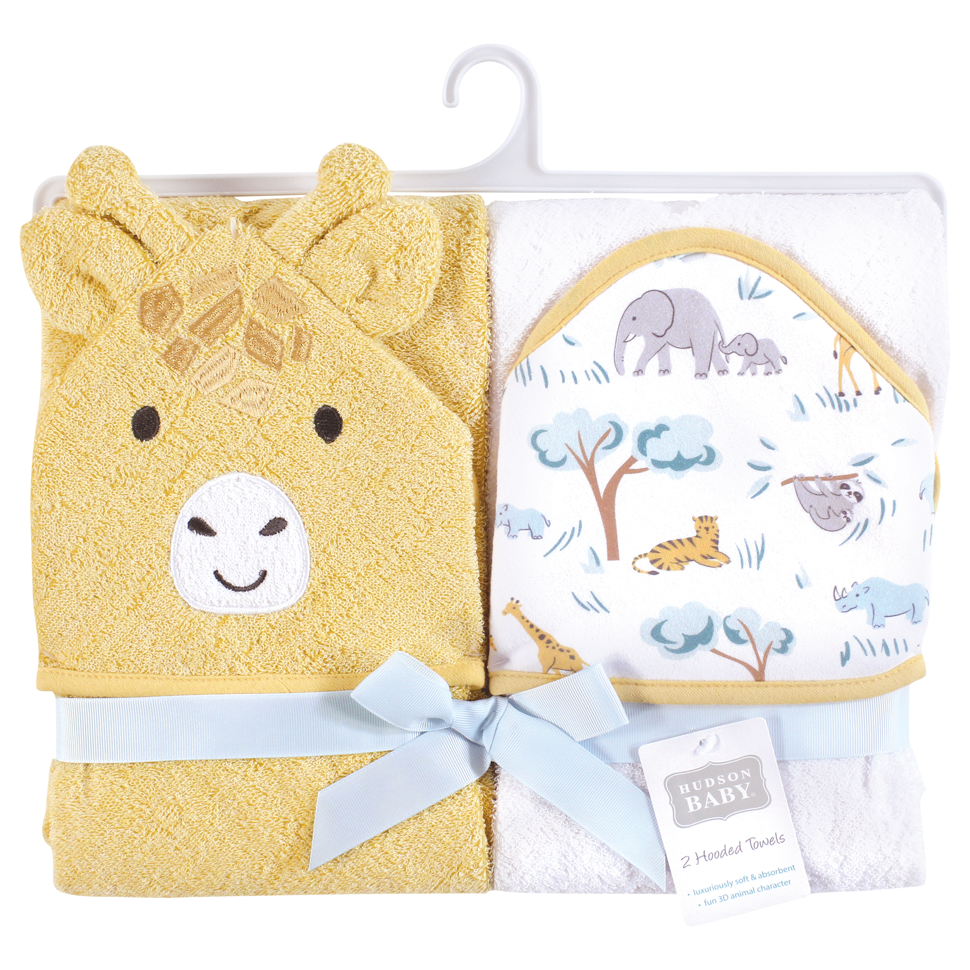 Hudson Baby animal face hooded towels are made of 100% woven cotton polyester terry and are available in a variety of adorable animal face options. Our hooded towels are more than generously sized at 30x30 inches to cover baby head to toe after bath or swim time. Our fun designs and large towels are perfect for baby and toddlers.