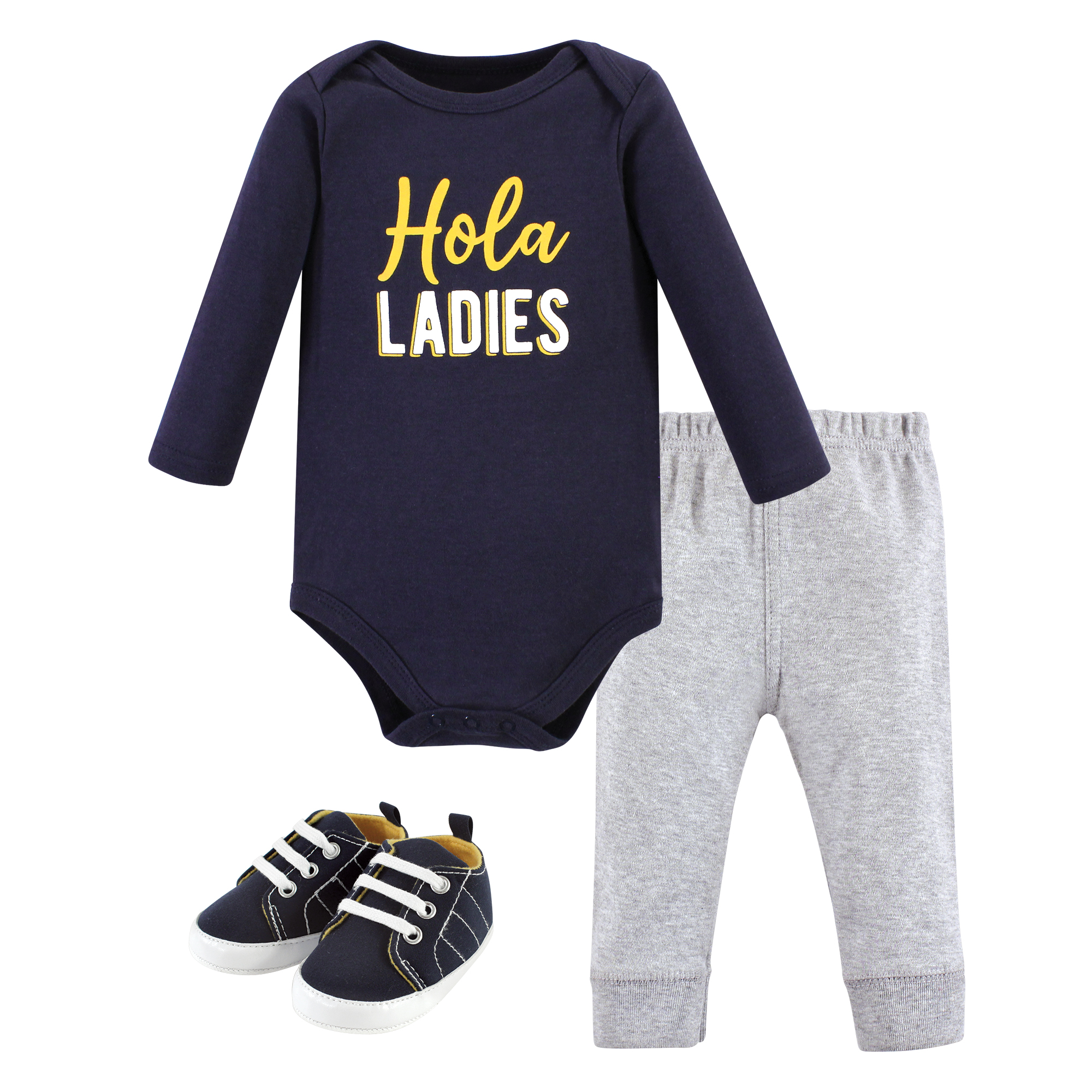 Hudson Baby bodysuit, pant, and shoes sets are an adorable, fashionable outfit to dress your baby for a day out. Your little one will be the most stylish, comfortable baby in the neighborhood with our bodysuit and pant and matching pair of shoes.