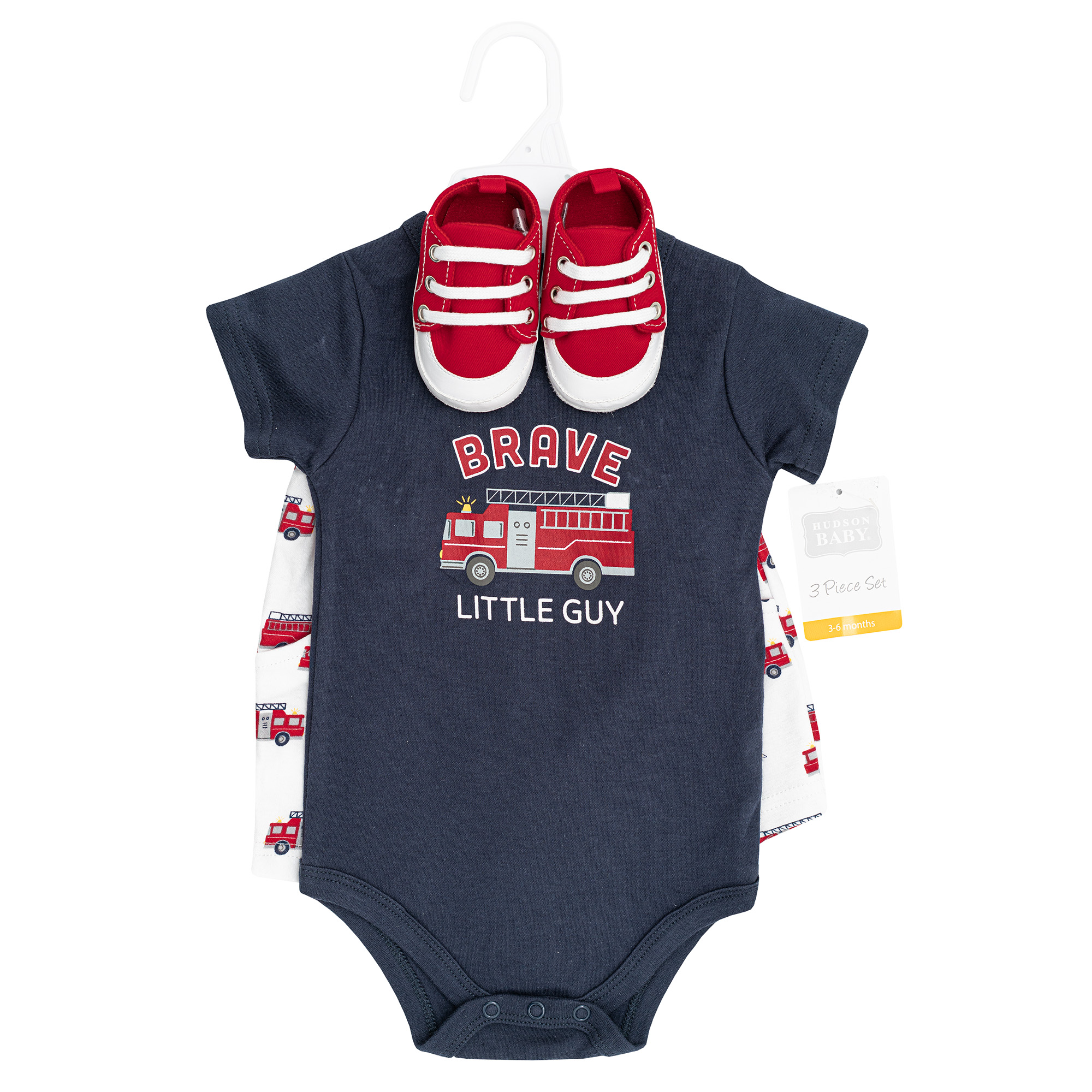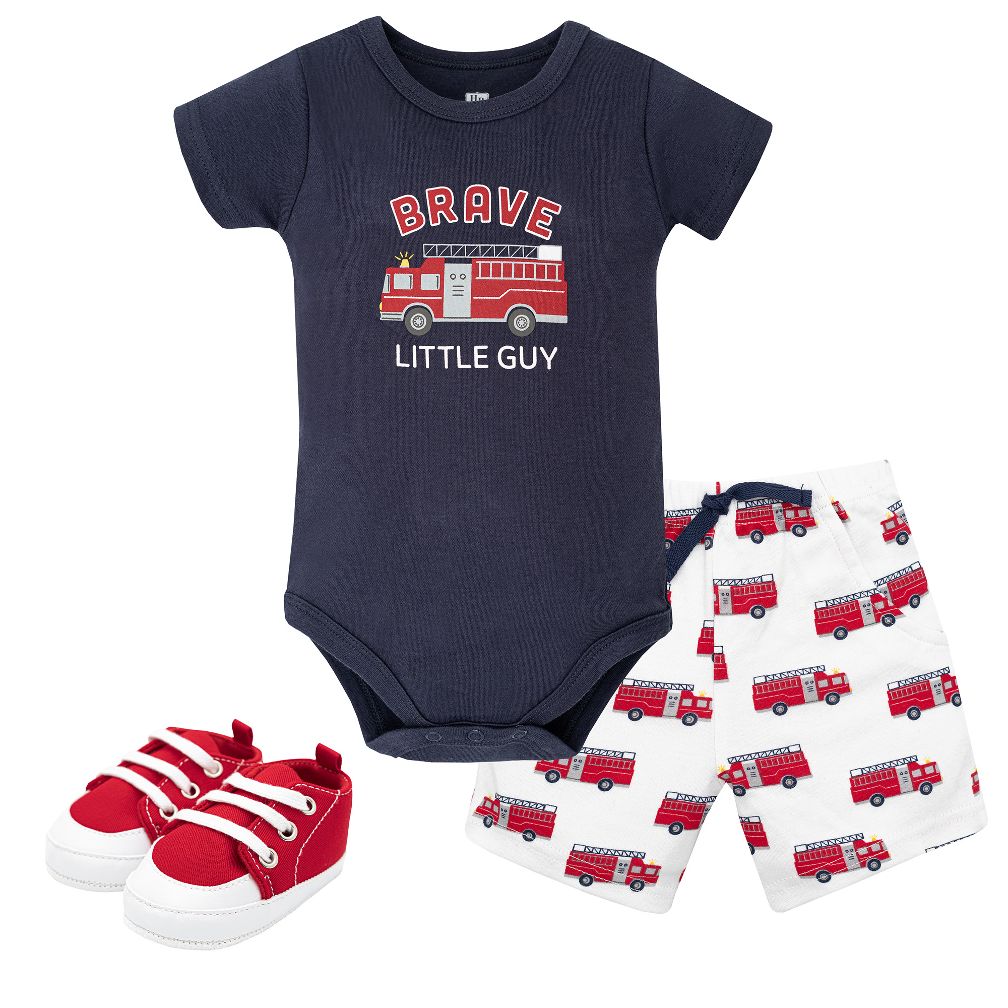 Hudson Baby Cotton Bodysuit, Shorts and Shoe Set, Brave Firetruck