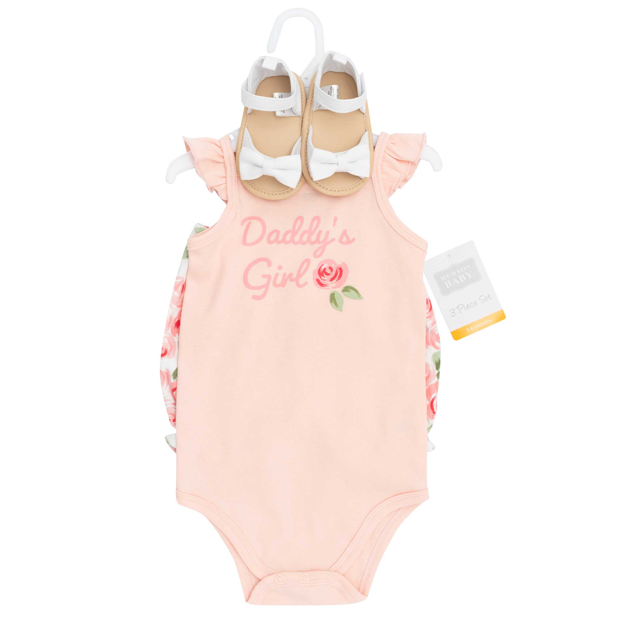 Hudson Baby bodysuit, shorts, and shoe is a perfect outfit to dress your baby for spring and summer days out. The outfit includes bodysuit and shorts made of 100% interlock cotton with a matching pair of shoes.