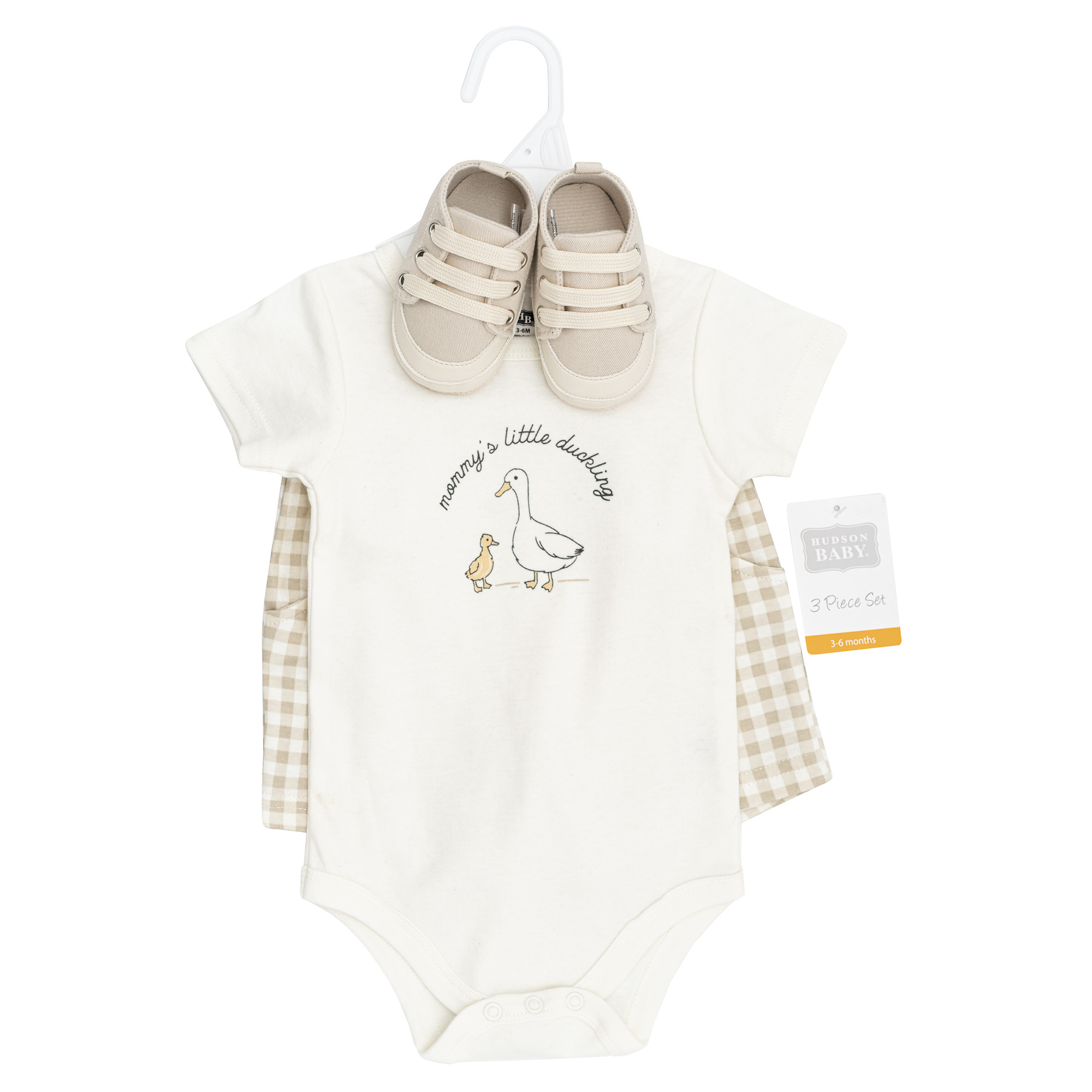 Product Description Hudson Baby bodysuit, shorts, and shoe is a perfect outfit to dress your baby for spring and summer days out. The outfit includes bodysuit and shorts made of 100% interlock cotton with a matching pair of shoes.