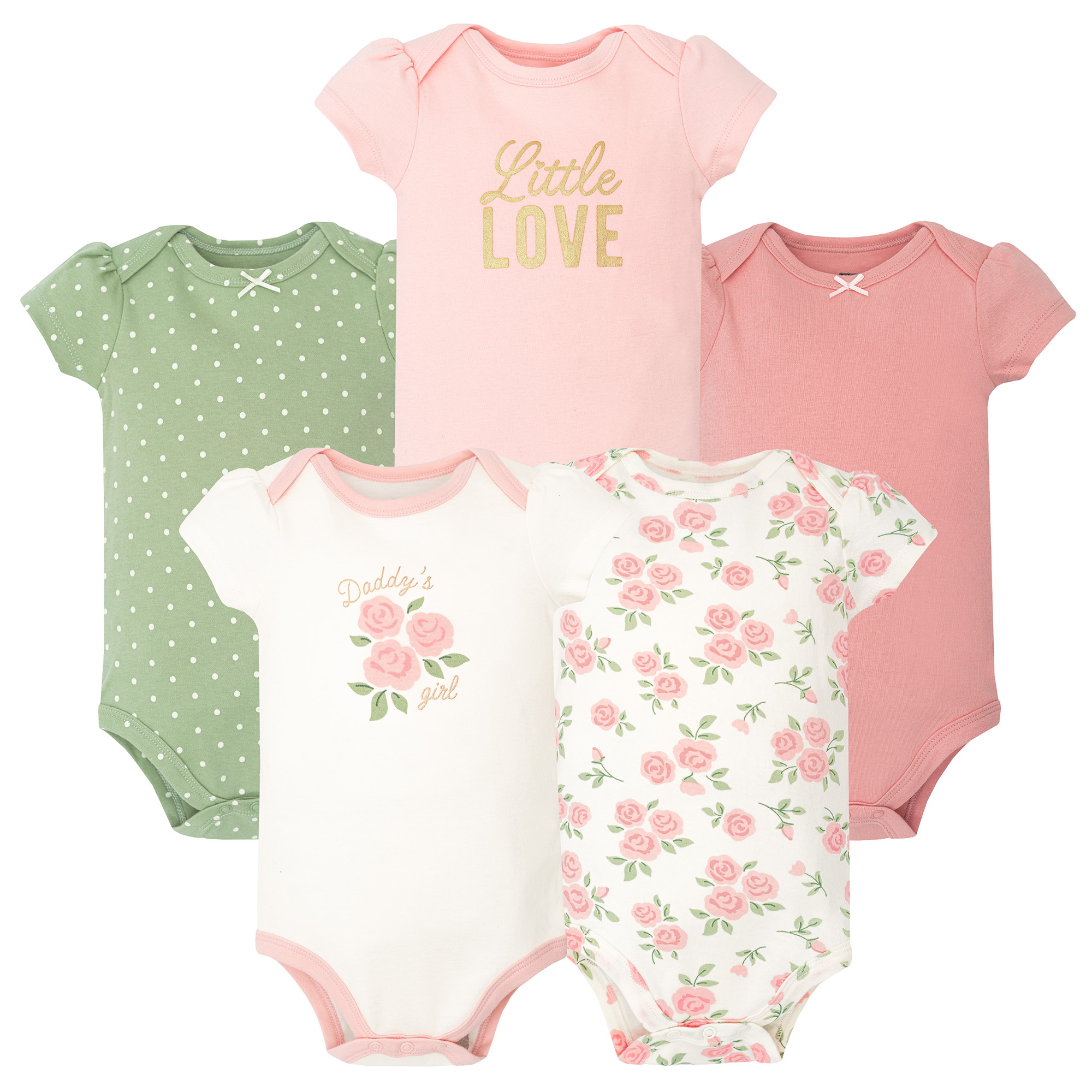 Hudson Baby Cotton Bodysuits 5-Pack, Soft Pink Sage Rose