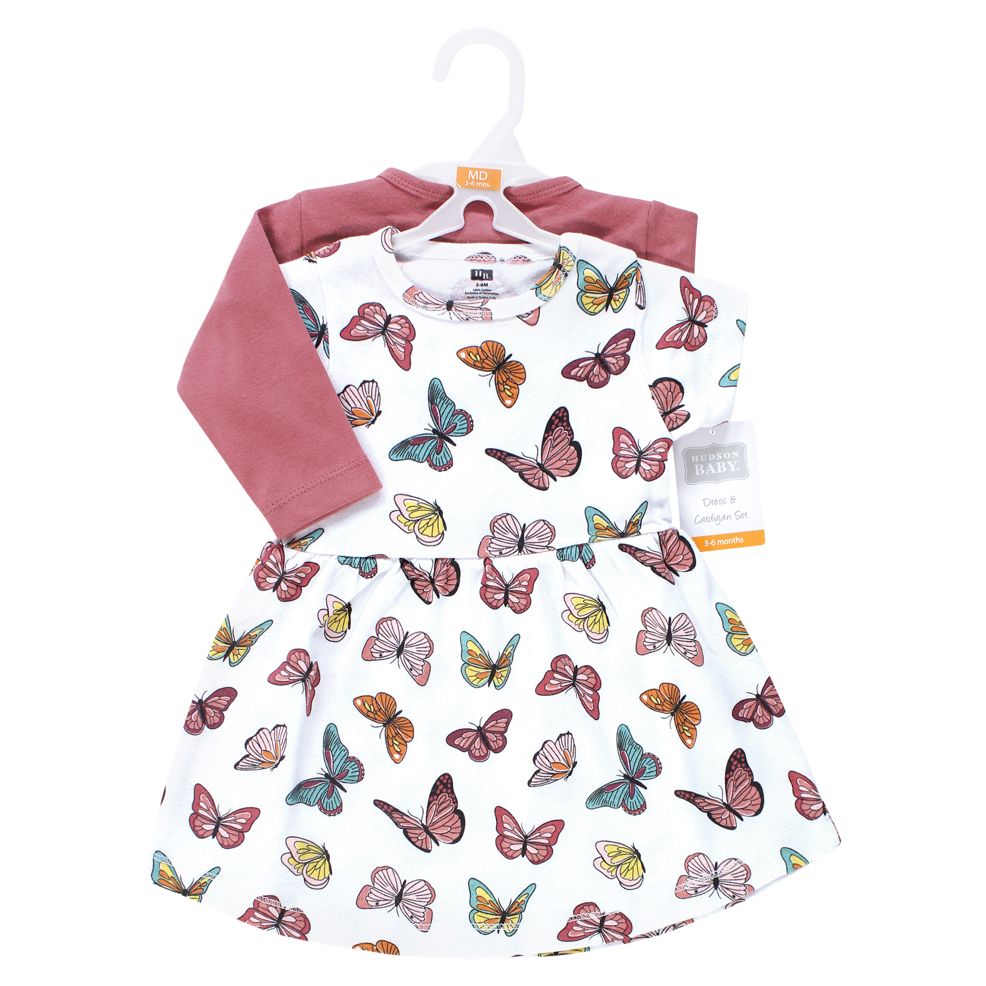 Hudson Baby Cotton Dress and Cardigan Set, Mauve Butterflies