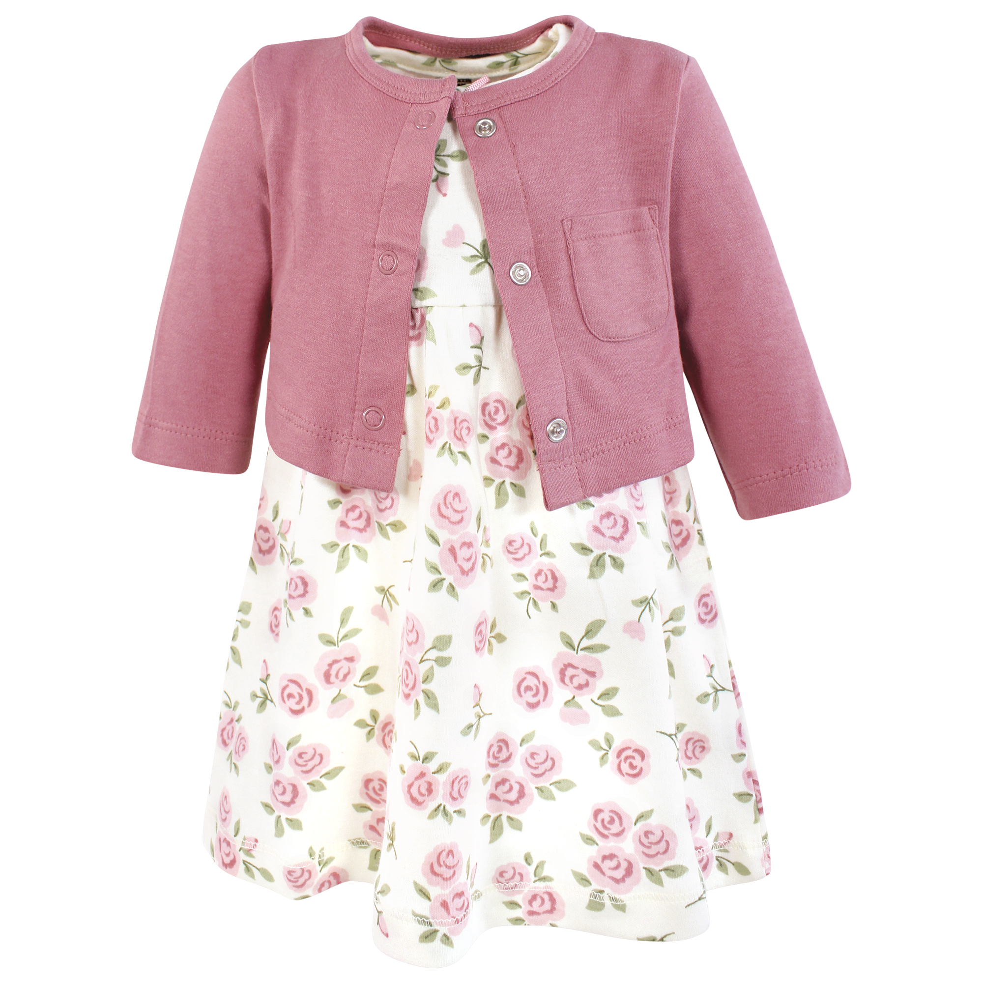 Hudson Baby Cotton Dress and Cardigan Set, Mauve Sage Rose