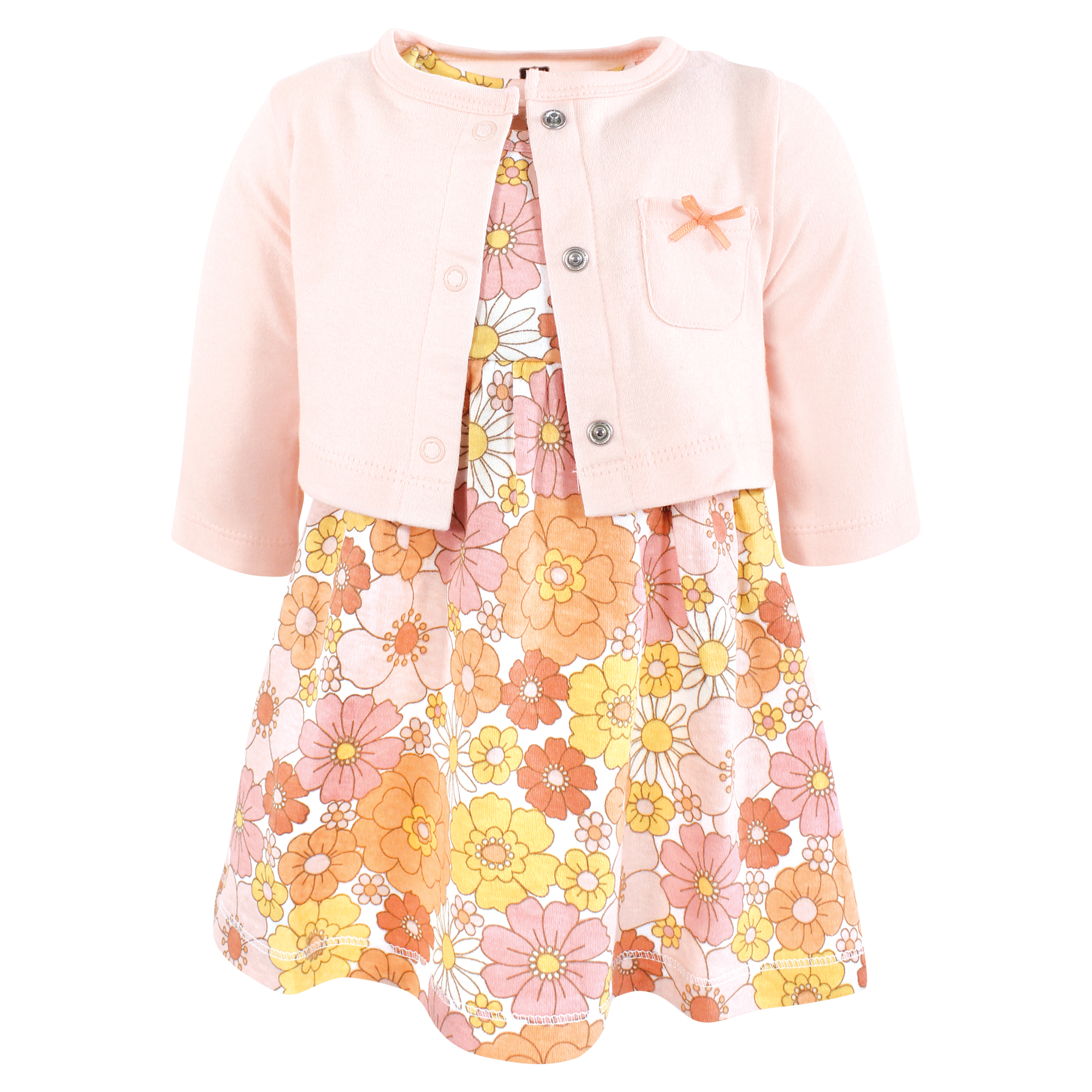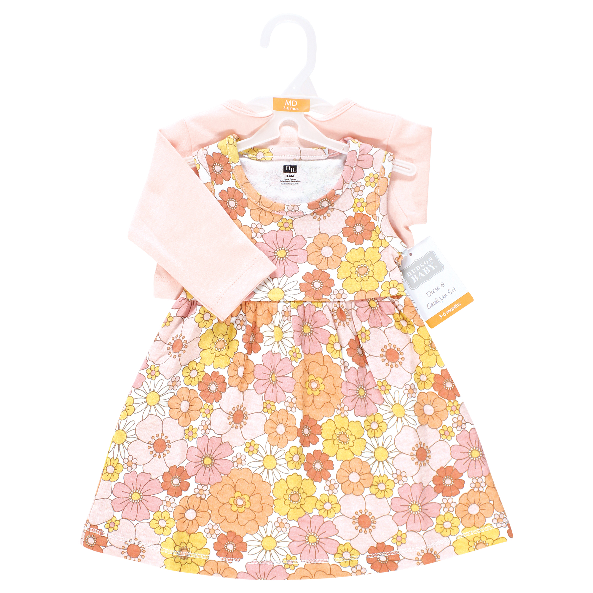 Hudson Baby Cotton Dress and Cardigan Set, Peach Love And Flowers