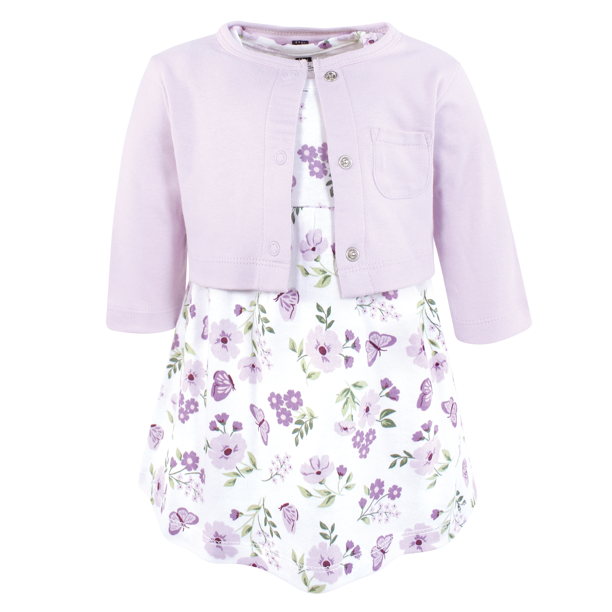 Hudson Baby Cotton Dress and Cardigan Set, Purple Butterfly Floral