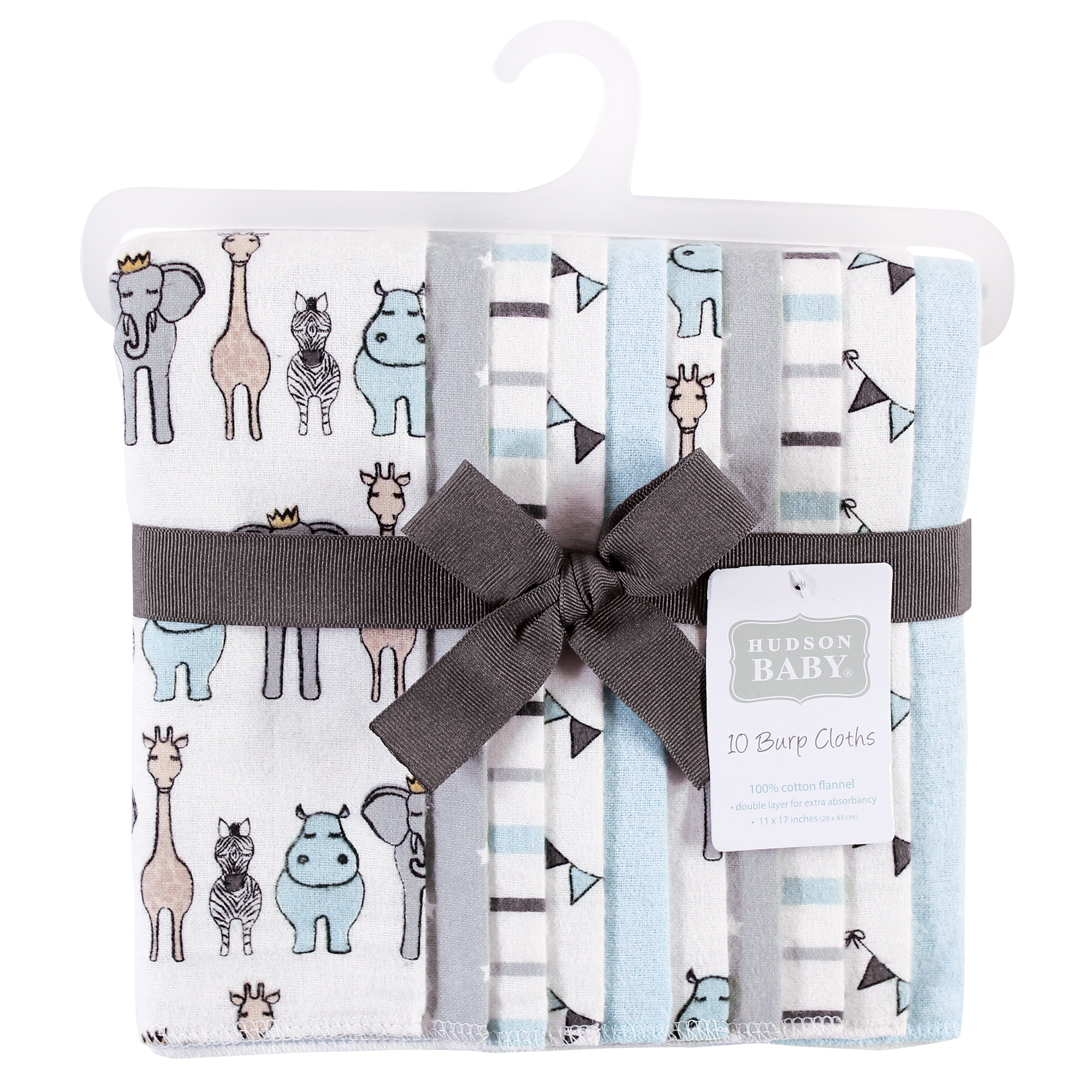 Hudson Baby flannel burp cloths feature multiple layers of fabric to help clean up the messes and spills that you are bound to encounter with your new baby. Our burp cloths are soft and gentle when used on baby's skin and help protect parent's clothes from drool and spills while feeding, burping, and snuggling baby. Our burp cloths will come in handy everyday, whether you are hanging out at home, traveling, or leaving your little one at daycare.