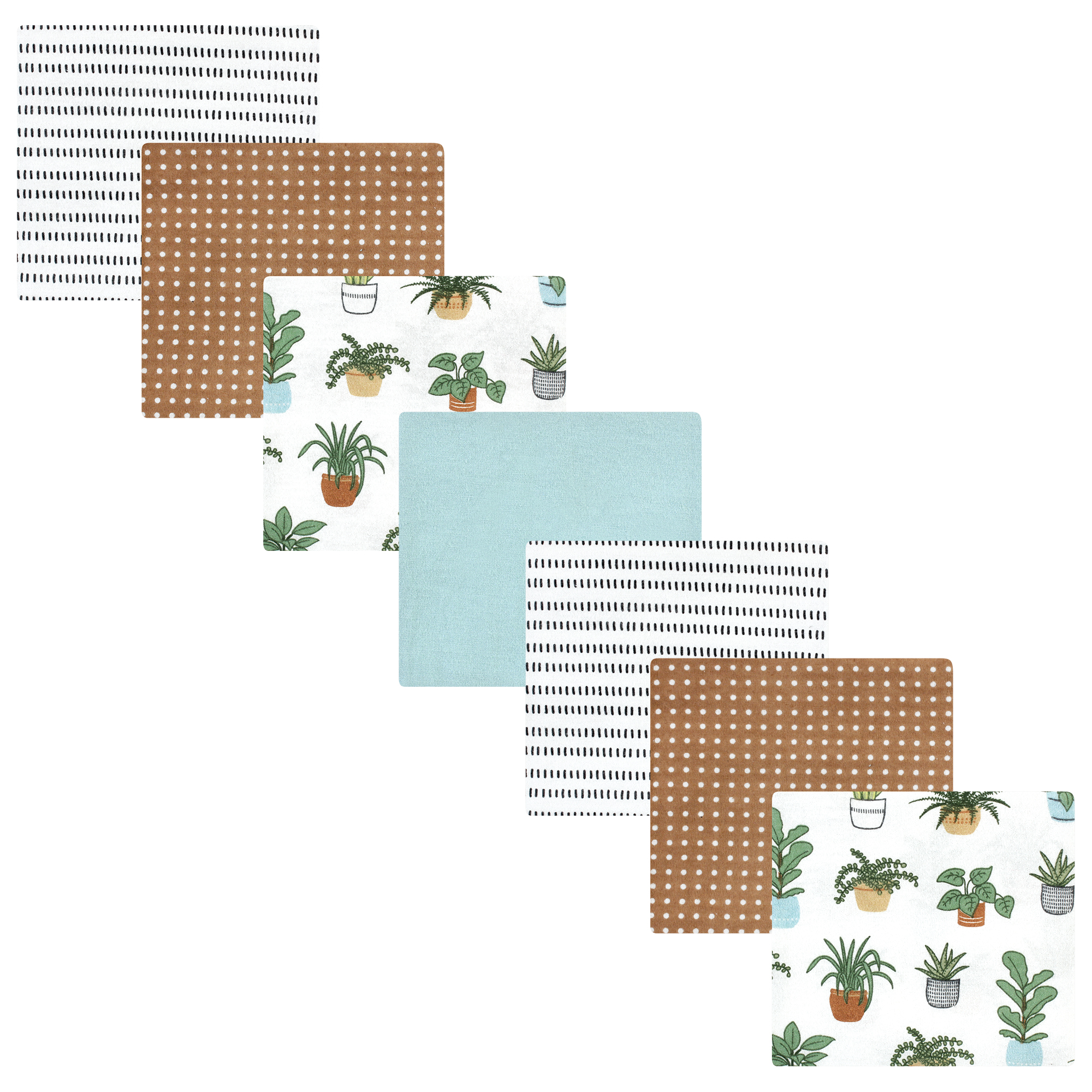 - Set of coordinating flannel blankets. Measures 30x30 inches.