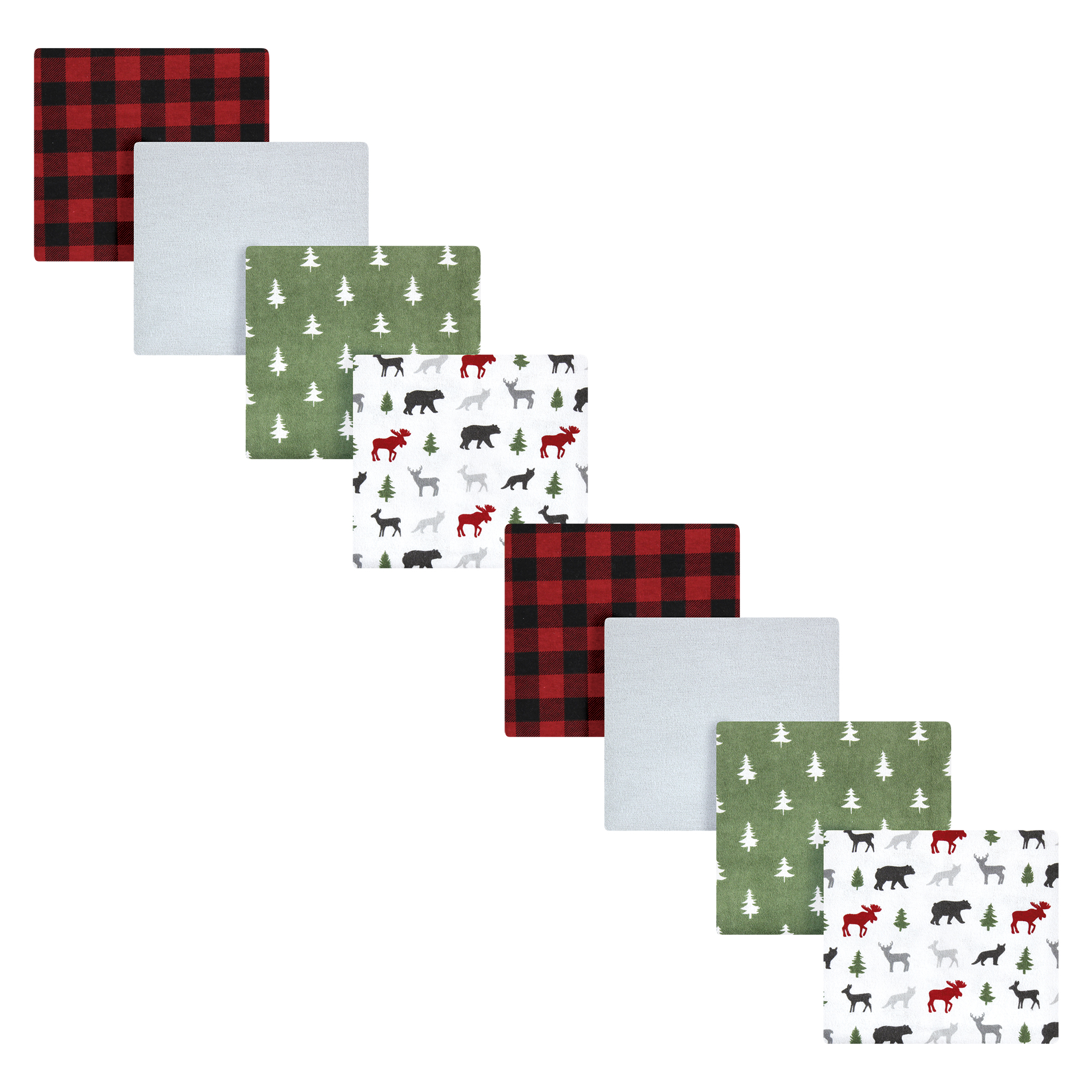 • Set of coordinating flannel blankets. Measures 30x30 inches.