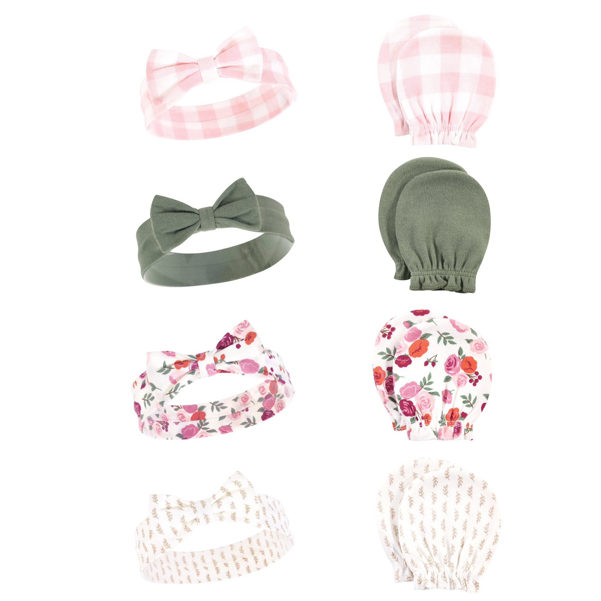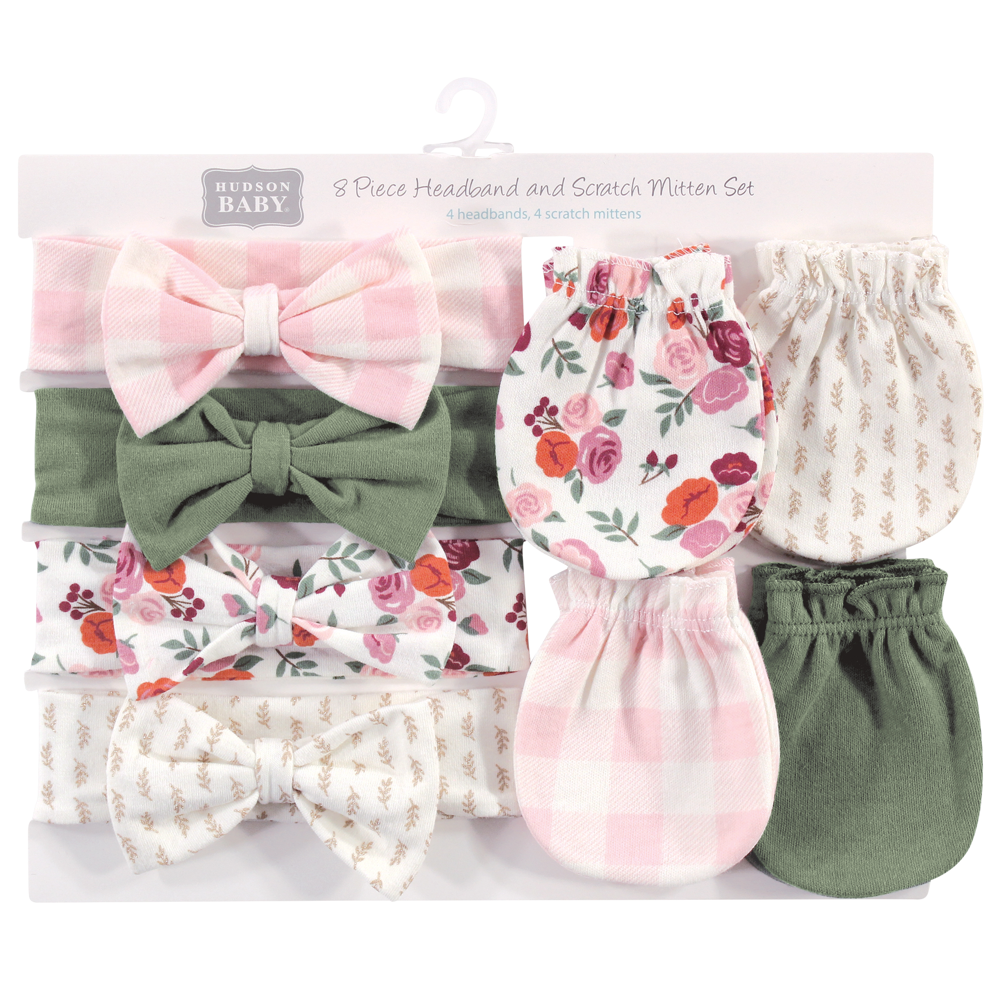 Hudson Baby headband and scratch mitten set is a perfect accessory set for your little girl. Each set comes with coordinating headbands and scratch mittens. Our headbands are a fun headwrap for your baby girl to look stylish with our adorable prints. Our scratch mittens are made with super soft cotton fabric and an elastic band around the wrist so the mittens stay on and protect your little one's face and body from any accidental scratches.