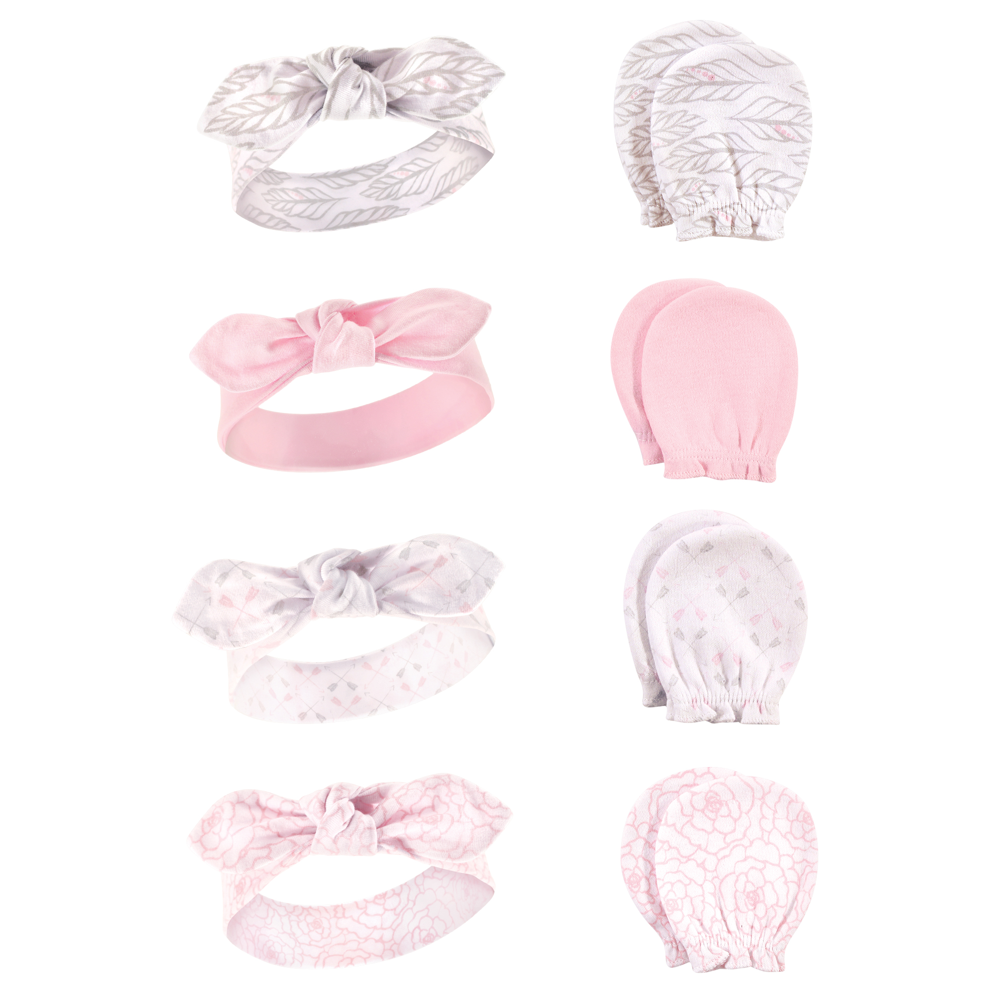 Hudson Baby headband and scratch mitten set is a perfect accessory set for your little girl. Each set comes with coordinating headbands and scratch mittens. Our headbands are a fun headwrap for your baby girl to look stylish with our adorable prints. Our scratch mittens are made with super soft cotton fabric and an elastic band around the wrist so the mittens stay on and protect your little one's face and body from any accidental scratches.