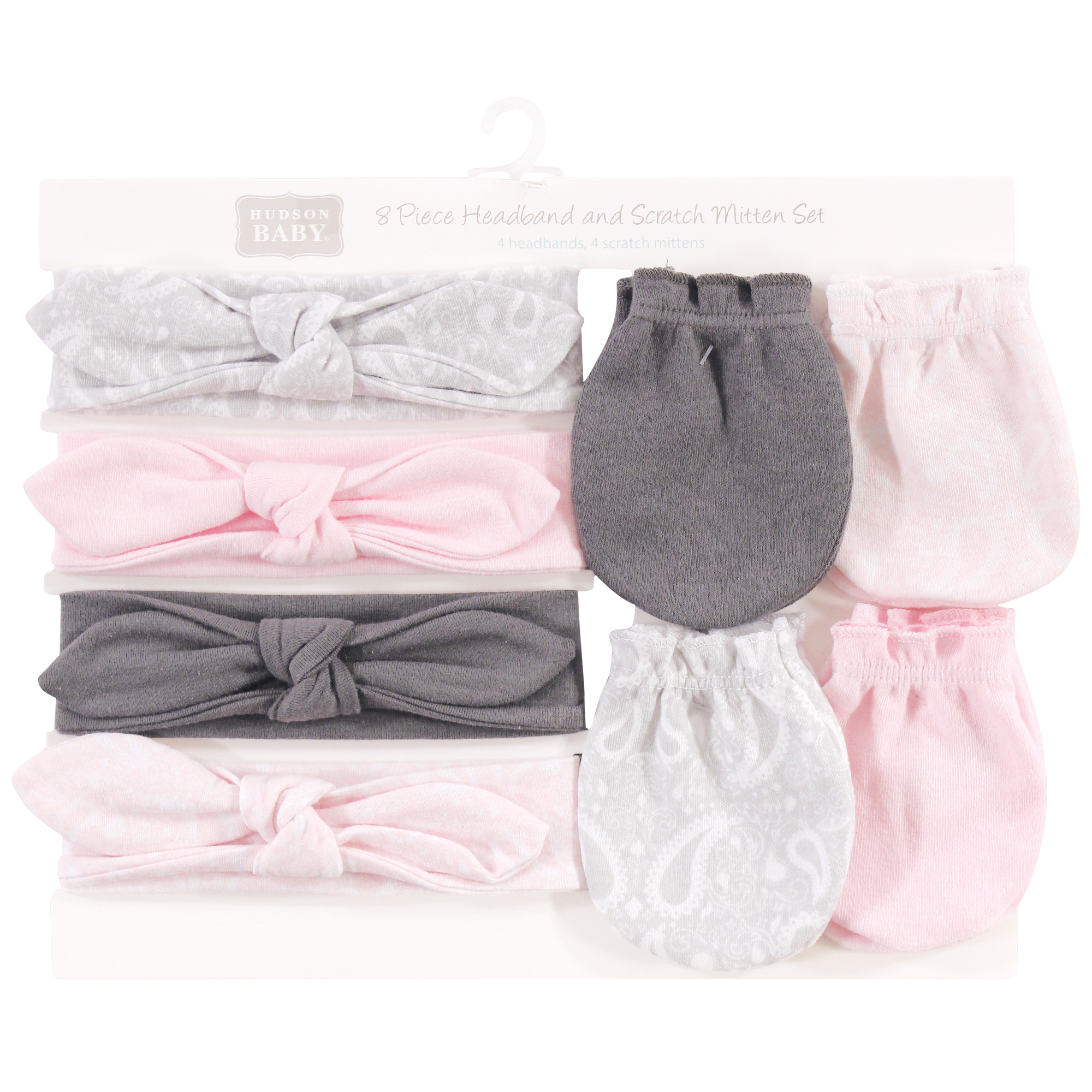 Hudson Baby headband and scratch mitten set is a perfect accessory set for your little girl. Each set comes with coordinating headbands and scratch mittens. Our headbands are a fun headwrap for your baby girl to look stylish with our adorable prints. Our scratch mittens are made with super soft cotton fabric and an elastic band around the wrist so the mittens stay on and protect your little one's face and body from any accidental scratches.