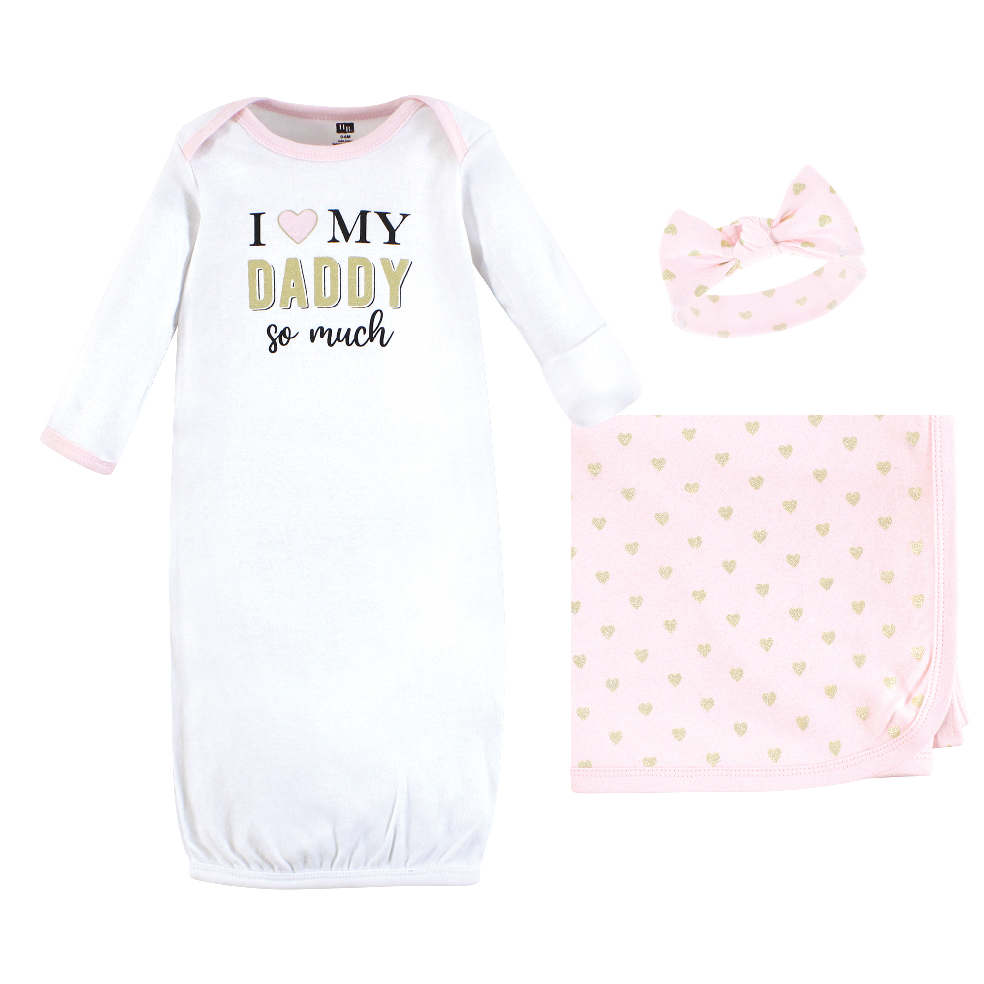 Hudson Baby Gown, Swaddle Blanket and Cap or Headband, Daddy Hearts