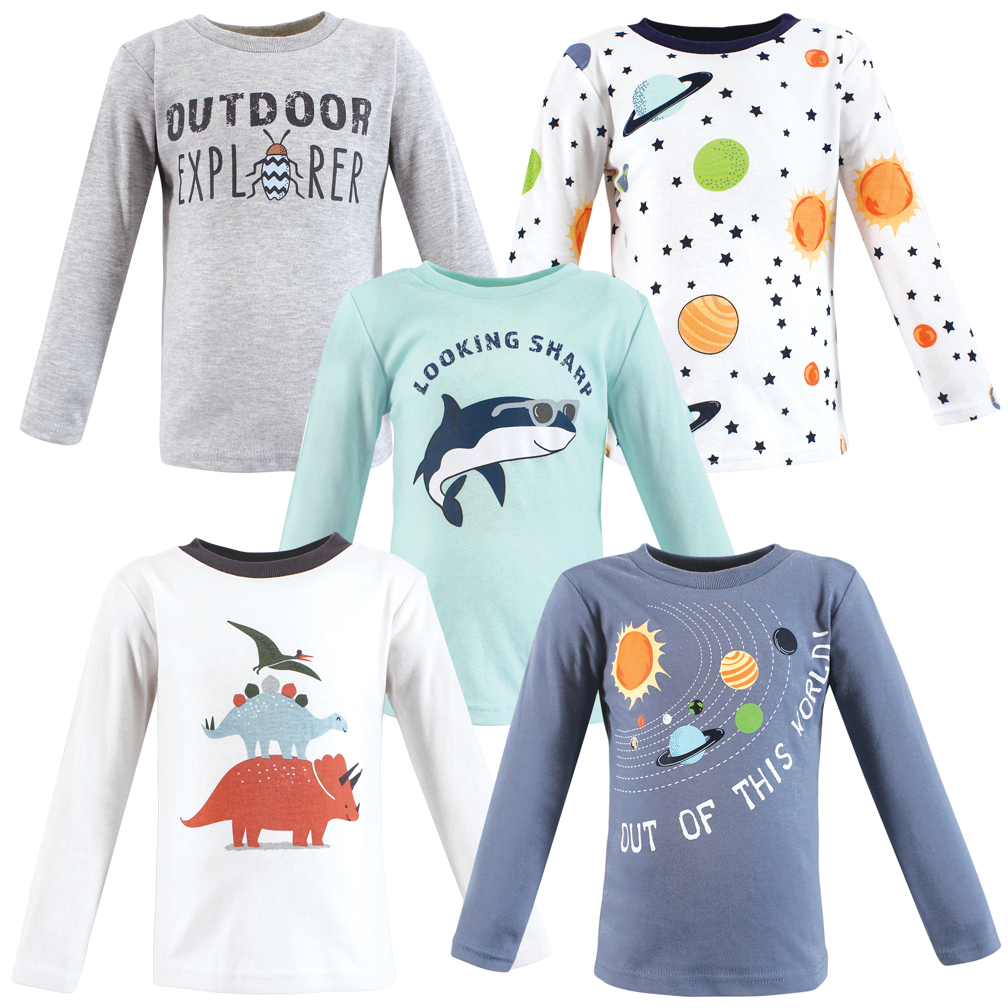Hudson Baby t-shirts are great everyday tops for your little ones. Featuring fun prints and patterns, our t-shirts are made with comfortable, soft cotton poly fabric that feels wonderful on children's skin. Our sets include five t-shirts so you can mix and match with your child's wardrobe for fun everyday outfits.