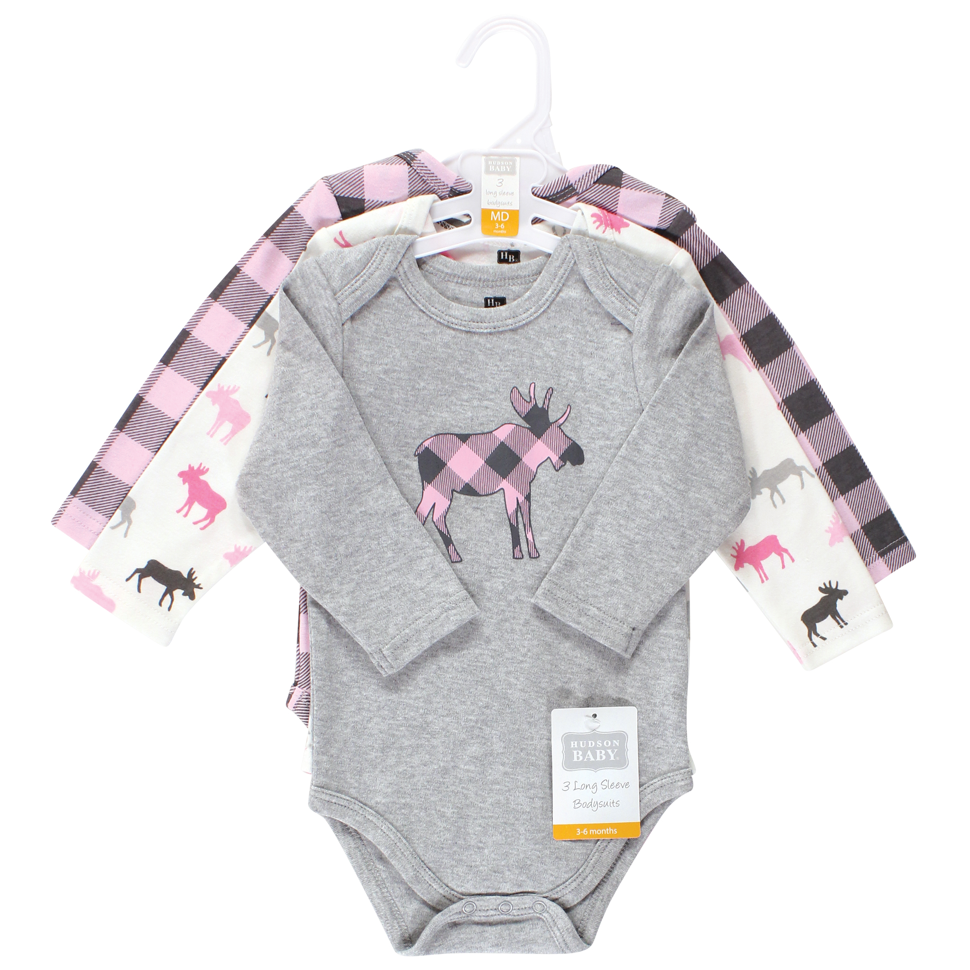 Hudson Baby Cotton Long-Sleeve Bodysuits, Pink Moose 3-Pack