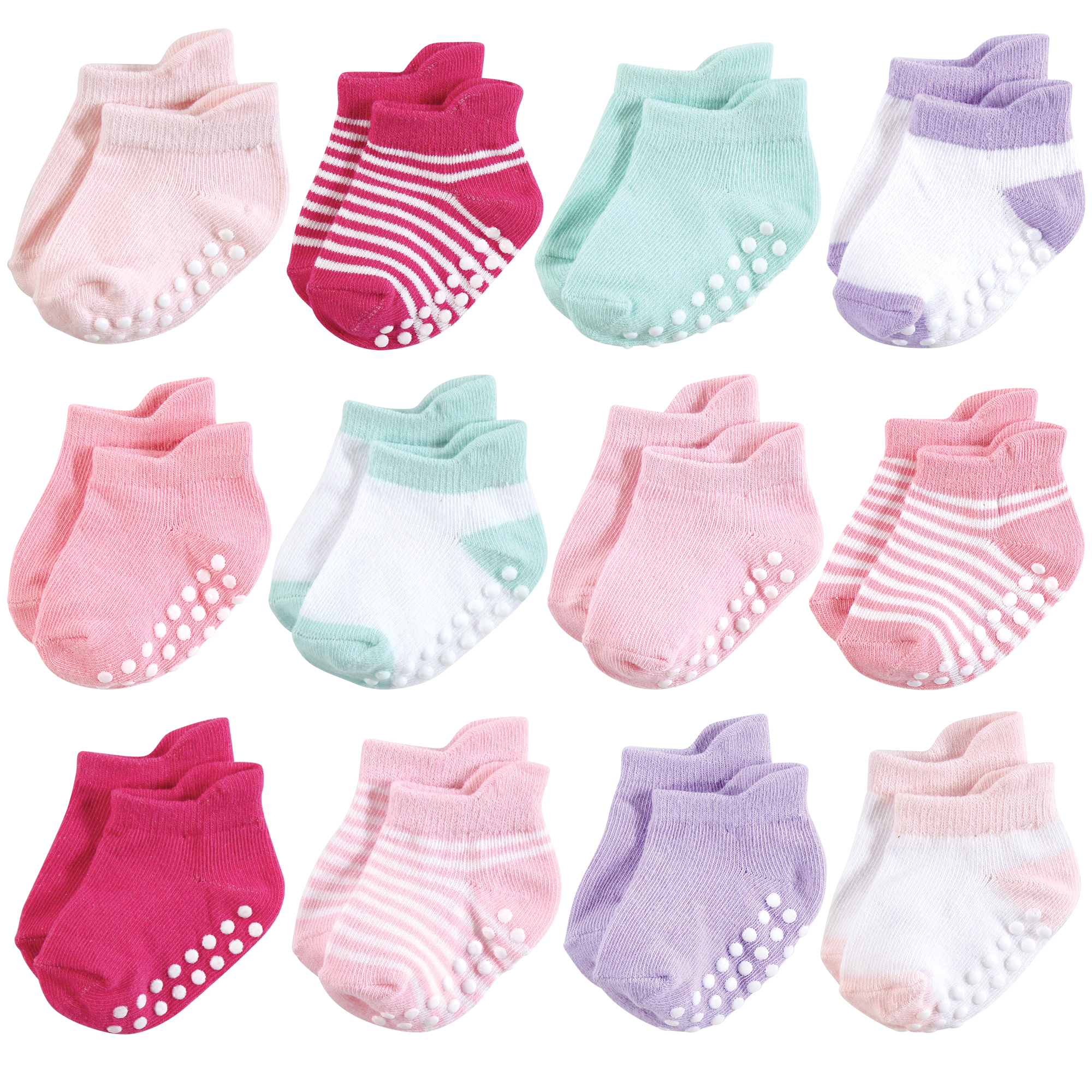 Hudson Baby socks are ideal baby socks for everyday wear with cotton-rich fabric that are soft and comfortable on your baby's tiny little feet. Our stretchable design makes for proper fit and no fuss dressing. Our non-skid grippers are perfect for little ones and toddlers walking and running, helping prevent trips and falls. Made with soft, cushy fabric, our socks are a great addition to your little one's outfit.