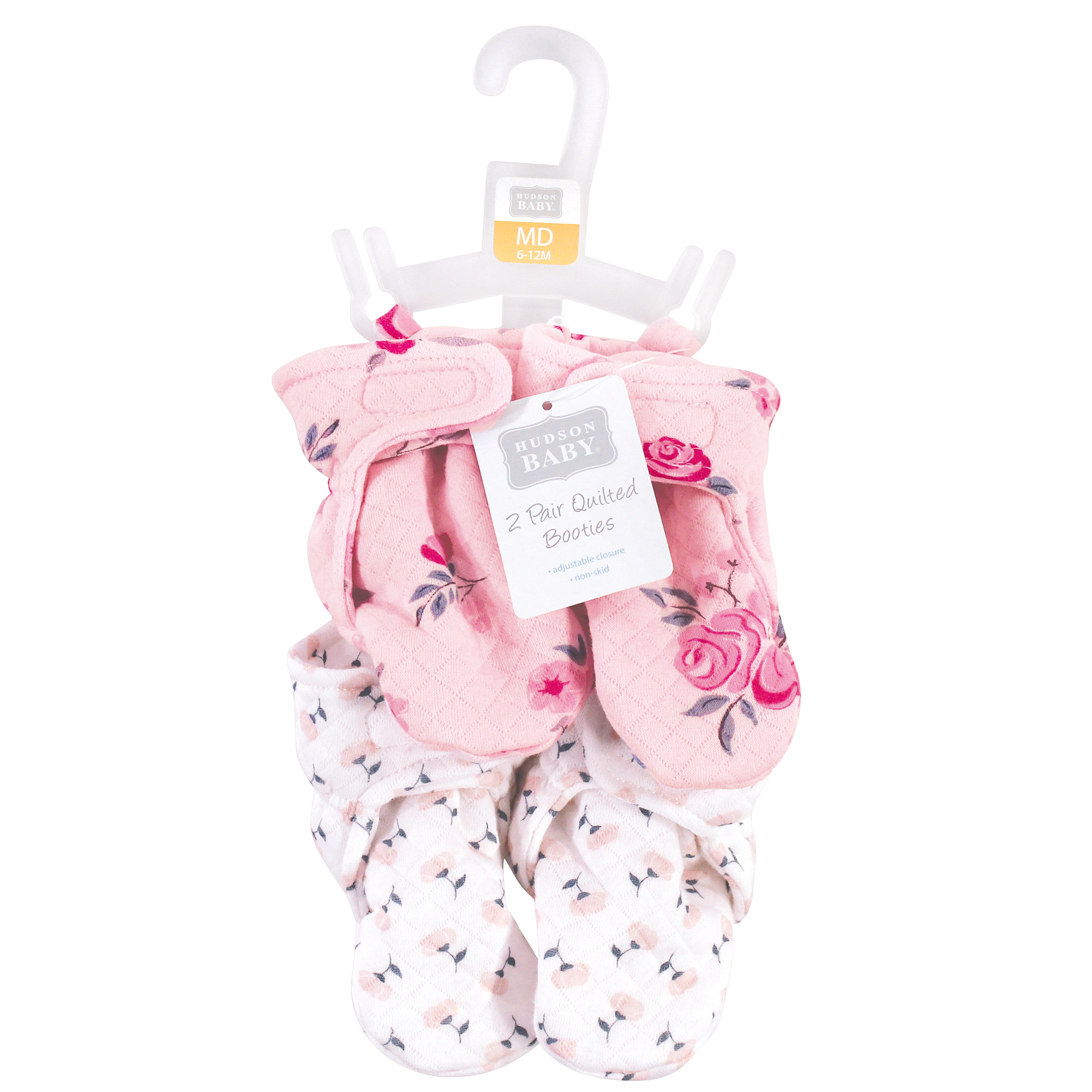 Hudson Baby quilted booties are comfortable, cozy baby booties made with quilted cotton material that will keep your little one's feet warm and comfortable. Our booties wrap around your baby's foot and fasten in the front with a velcro closure, so they are easy to put on, fasten and stay on. Our quilted booties feature non-skid soles to prevent your baby from slipping and falling when they start to walk and run.