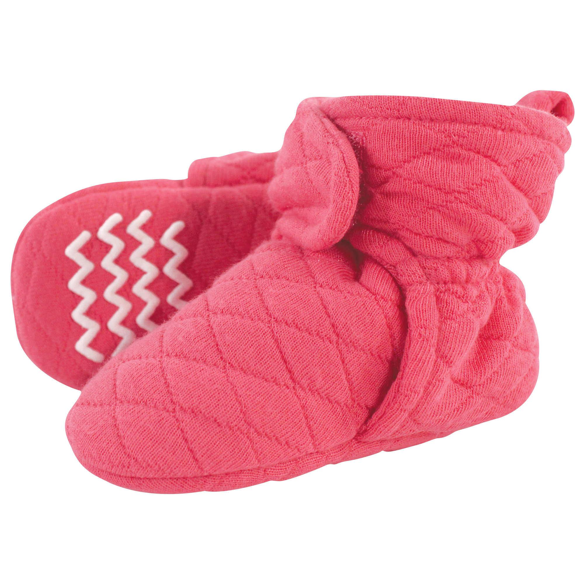 Hudson Baby quilted booties are comfortable, cozy baby booties made with quilted cotton material that will keep your little one's feet warm and comfortable. Our booties wrap around your baby's foot and fasten in the front with a velcro closure, so they are easy to put on, fasten and stay on. Our quilted booties feature non-skid soles to prevent your baby from slipping and falling when they start to walk and run.