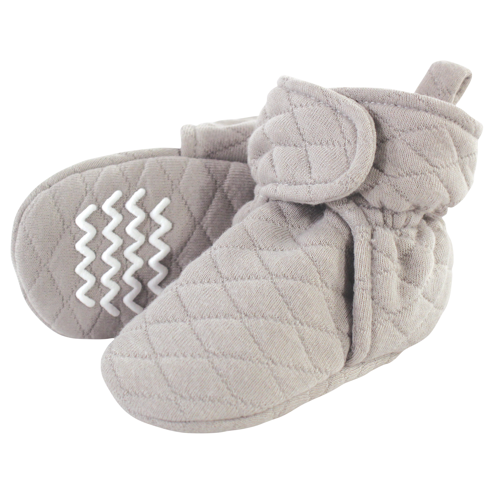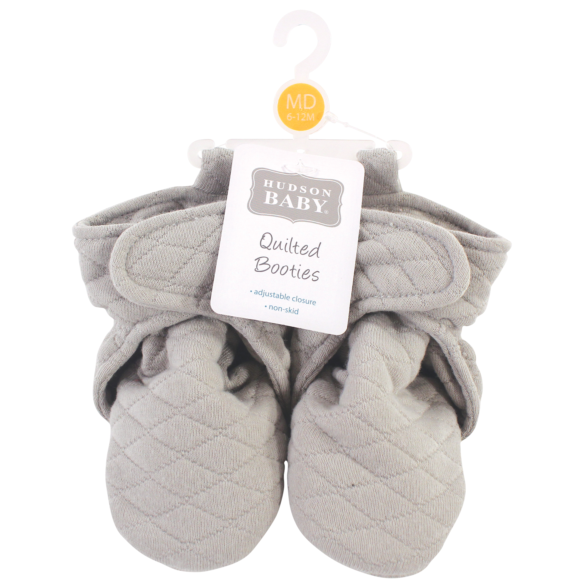 Hudson Baby quilted booties are comfortable, cozy baby booties made with quilted cotton material that will keep your little one's feet warm and comfortable. Our booties wrap around your baby's foot and fasten in the front with a velcro closure, so they are easy to put on, fasten and stay on. Our quilted booties feature non-skid soles to prevent your baby from slipping and falling when they start to walk and run.