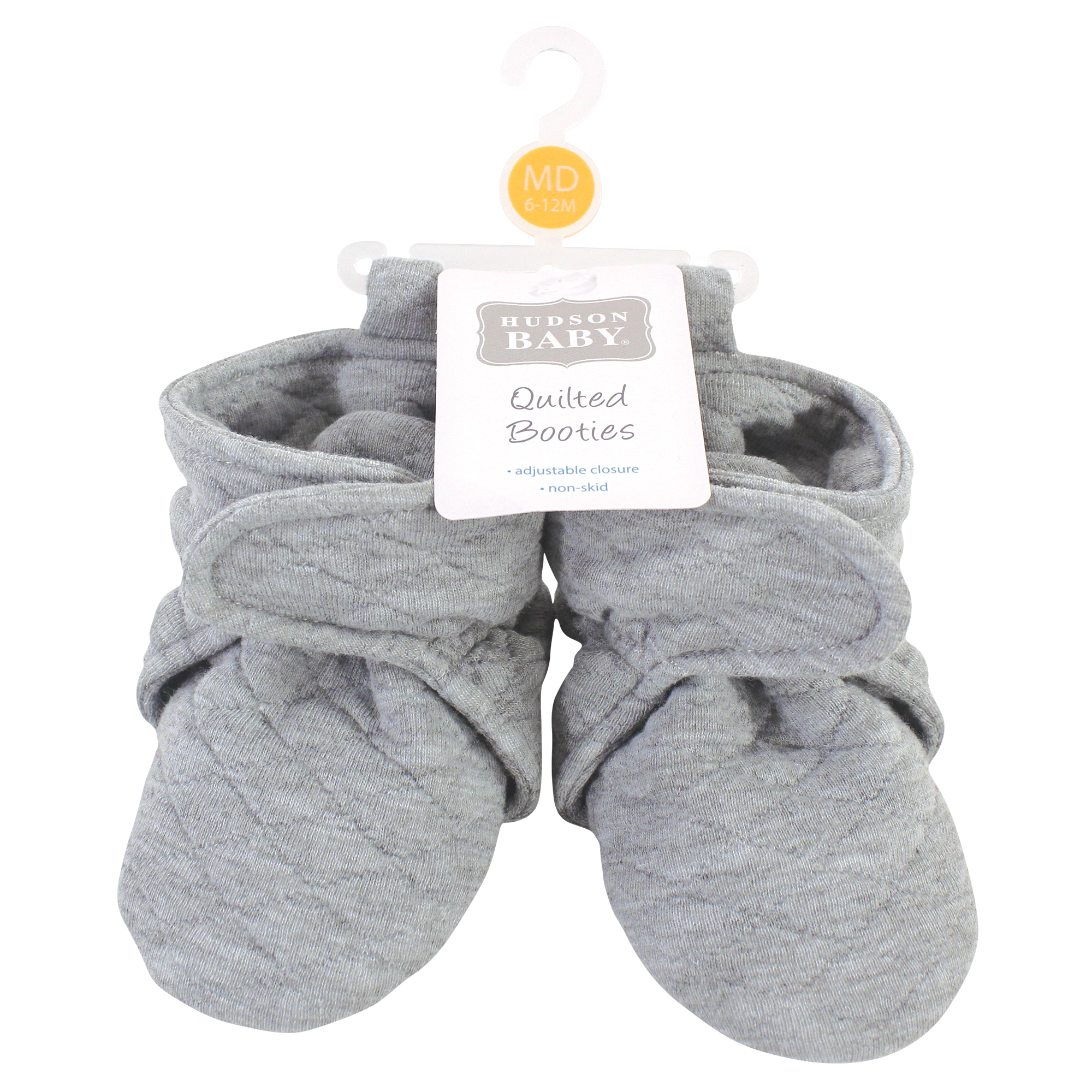 Hudson Baby quilted booties are comfortable, cozy baby booties made with quilted cotton material that will keep your little one's feet warm and comfortable. Our booties wrap around your baby's foot and fasten in the front with a velcro closure, so they are easy to put on, fasten and stay on. Our quilted booties feature non-skid soles to prevent your baby from slipping and falling when they start to walk and run.