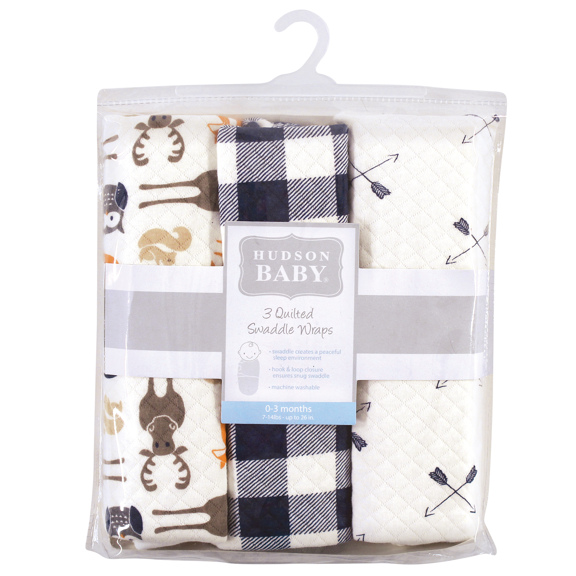 Hudson Baby quilted cotton swaddle wraps are the perfect swaddles to keep your baby comfortable, cozy and snug through the night. Our swaddles feature hook and loop closures for arms to be swaddled snug to body so baby feels safe and secure at night. Swaddle wrap provides a safe sleep environment. Never use swaddle when baby can roll over.