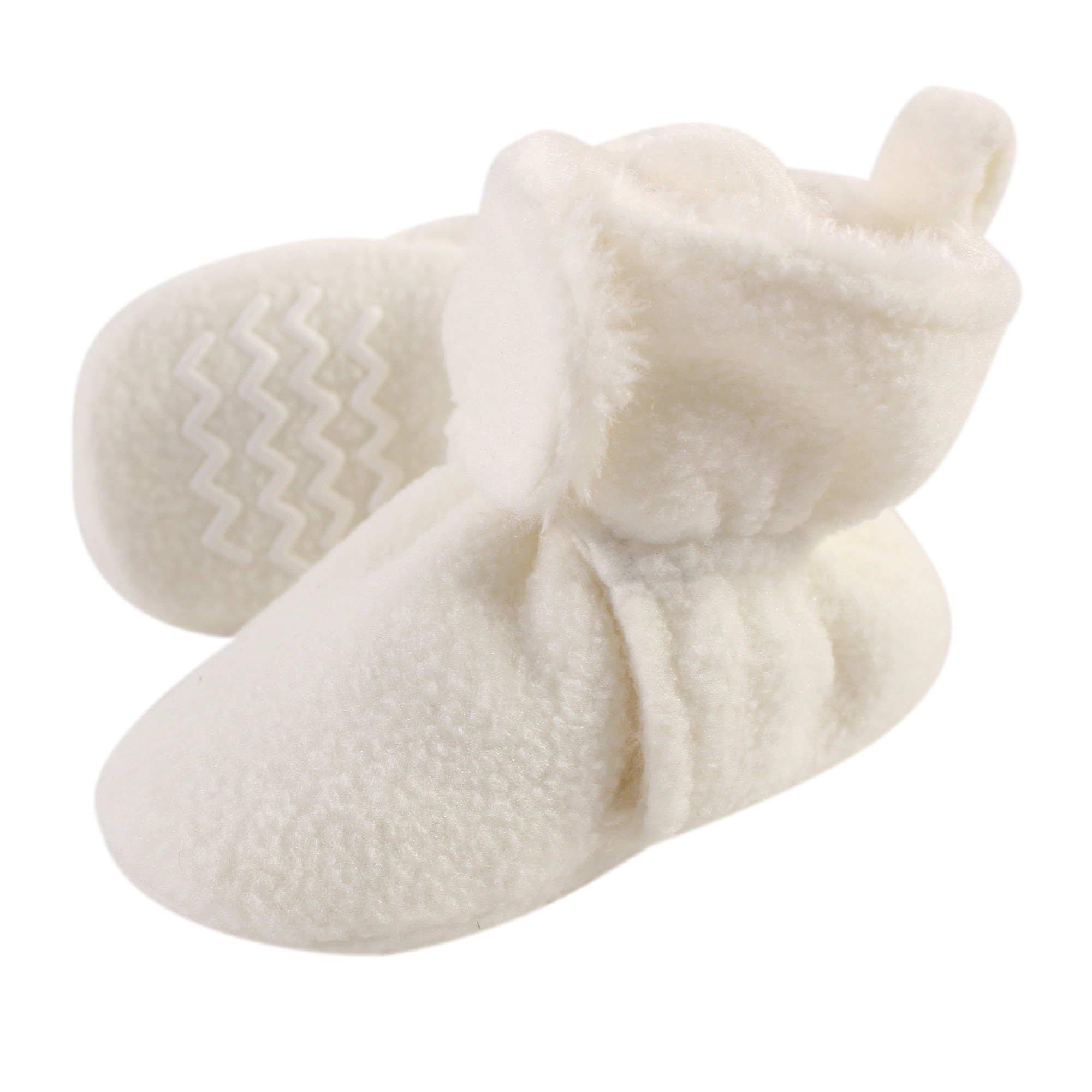 Hudson Baby fleece sherpa booties are comfortable, cozy baby booties made with fleece/sherpa material that will keep your little one's feet warm and comfortable. Our booties wrap around your baby's foot and fasten in the front with a velcro closure, so they are easy to put on, fasten and stay on. Our fleece/sherpa booties feature non-skid soles to prevent your baby from slipping and falling when they start to walk and run.