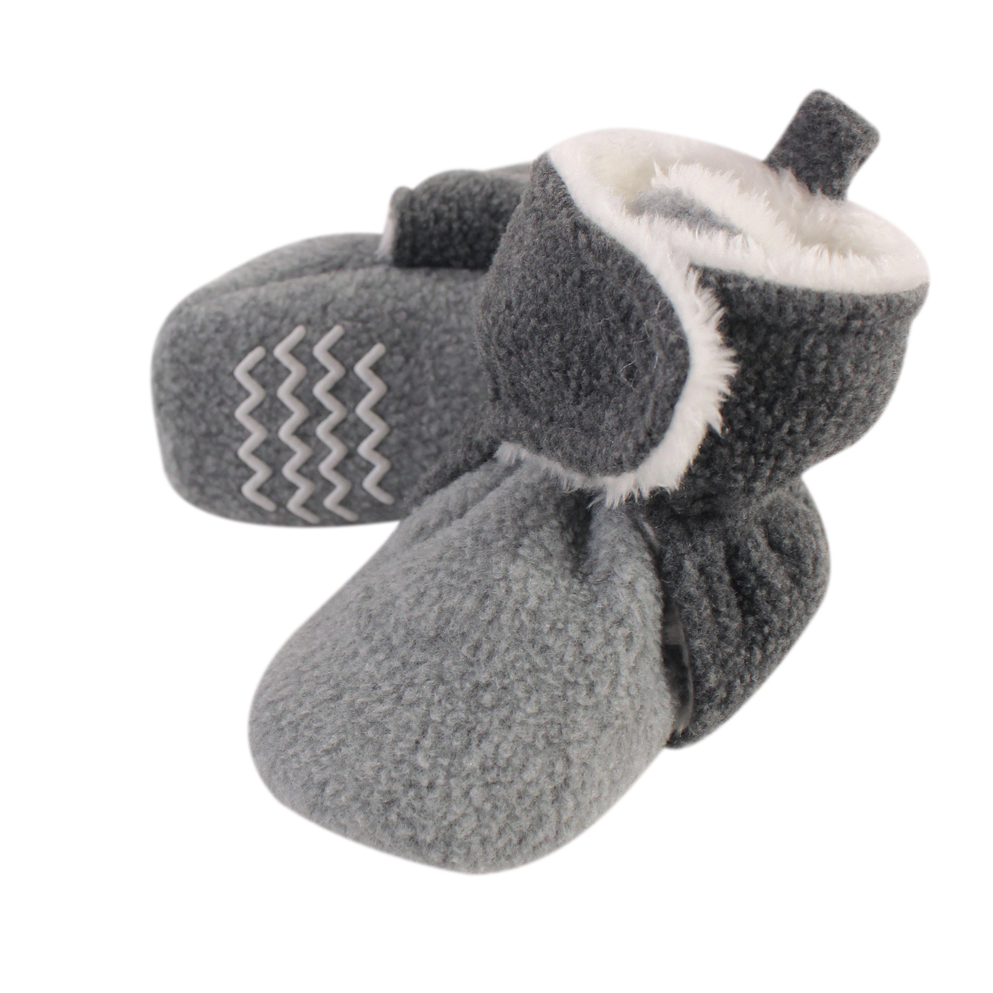 Hudson Baby fleece sherpa booties are comfortable, cozy baby booties made with fleece/sherpa material that will keep your little one's feet warm and comfortable. Our booties wrap around your baby's foot and fasten in the front with a velcro closure, so they are easy to put on, fasten and stay on. Our fleece/sherpa booties feature non-skid soles to prevent your baby from slipping and falling when they start to walk and run.