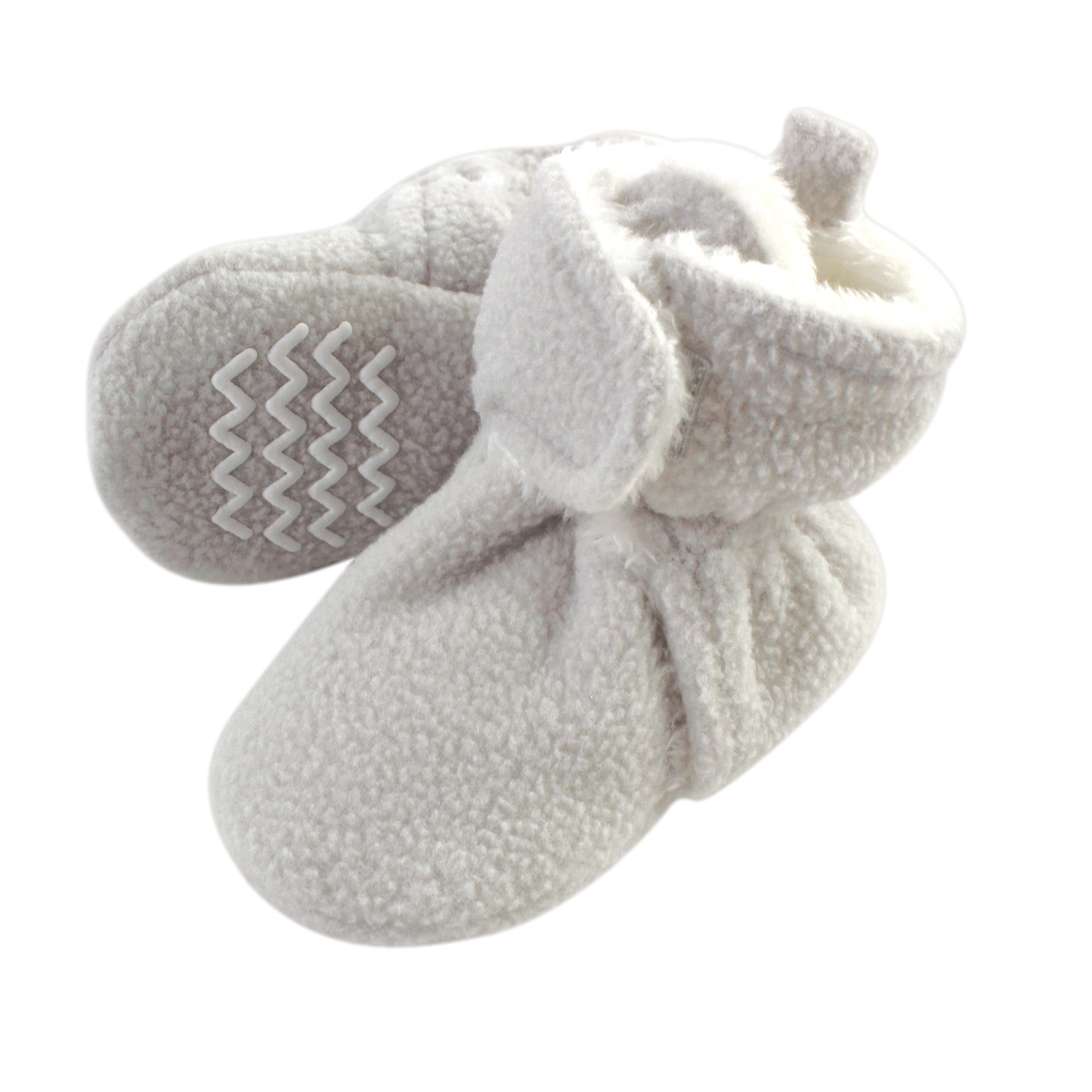 Hudson Baby fleece sherpa booties are comfortable, cozy baby booties made with fleece/sherpa material that will keep your little one's feet warm and comfortable. Our booties wrap around your baby's foot and fasten in the front with a velcro closure, so they are easy to put on, fasten and stay on. Our fleece/sherpa booties feature non-skid soles to prevent your baby from slipping and falling when they start to walk and run.