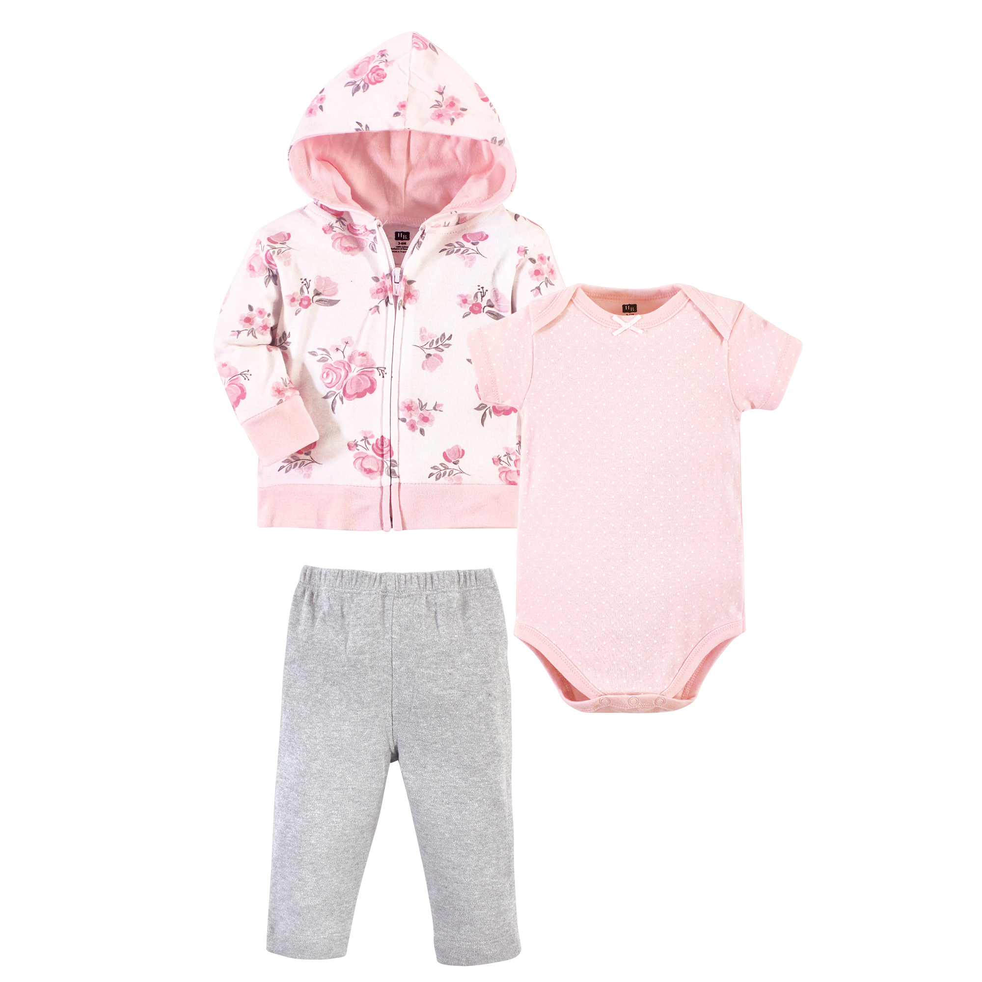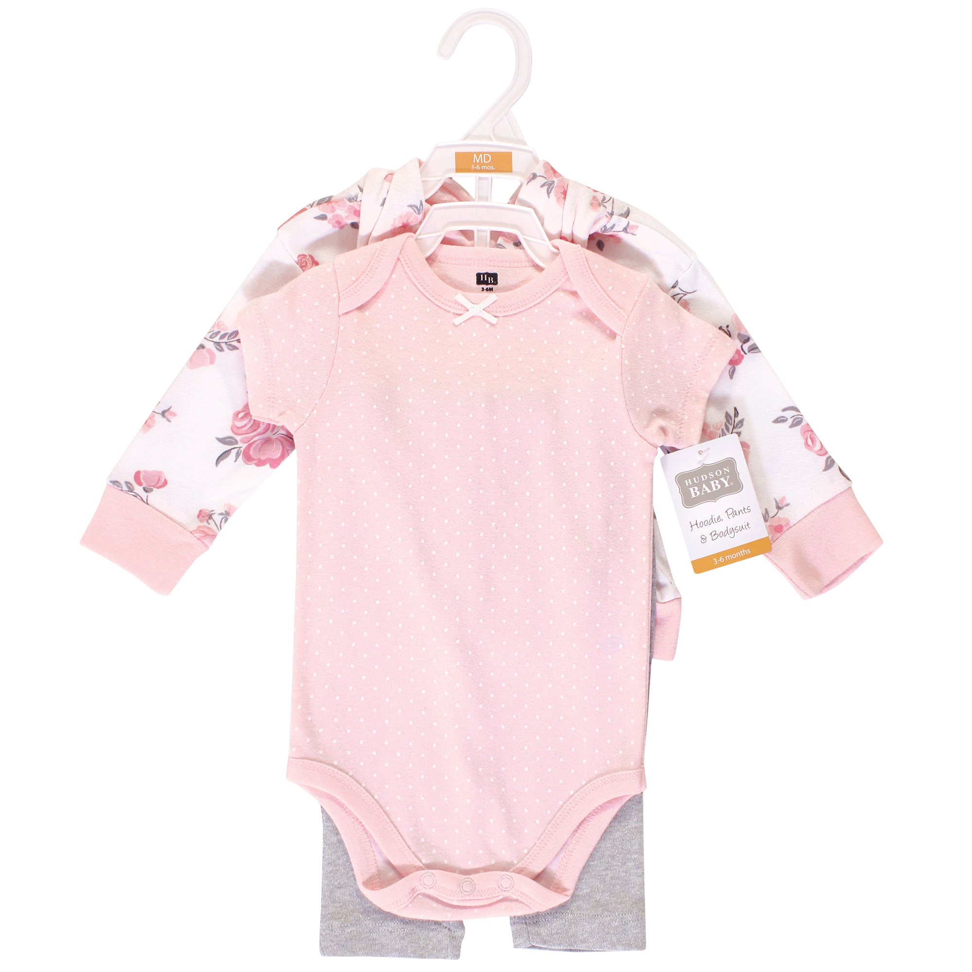 Product Description Hudson Baby hoodie, bodysuit or tee top and pant is a great outfit for your little one. Made with 100% cotton, our layette set is optimal for wearing at home or as outer wear.