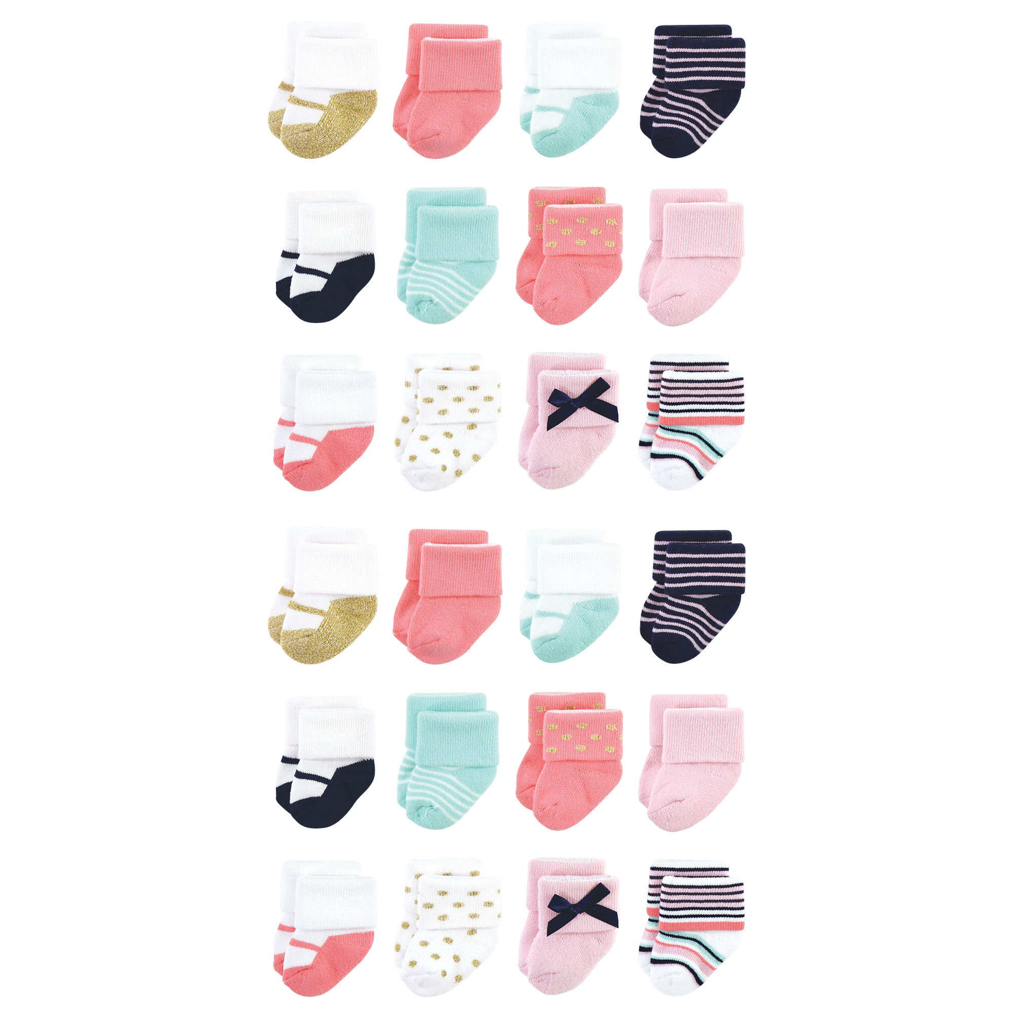 Little Treasure terry socks are soft, snuggly, warm socks to keep baby's feet feeling cozy and comfortable. The fold-over cuff style make it easier to keep baby's socks on their feet. Our super soft cotton blend socks are gentle and are made with thick, cushiony fabric to keep baby's feet warm and snug.