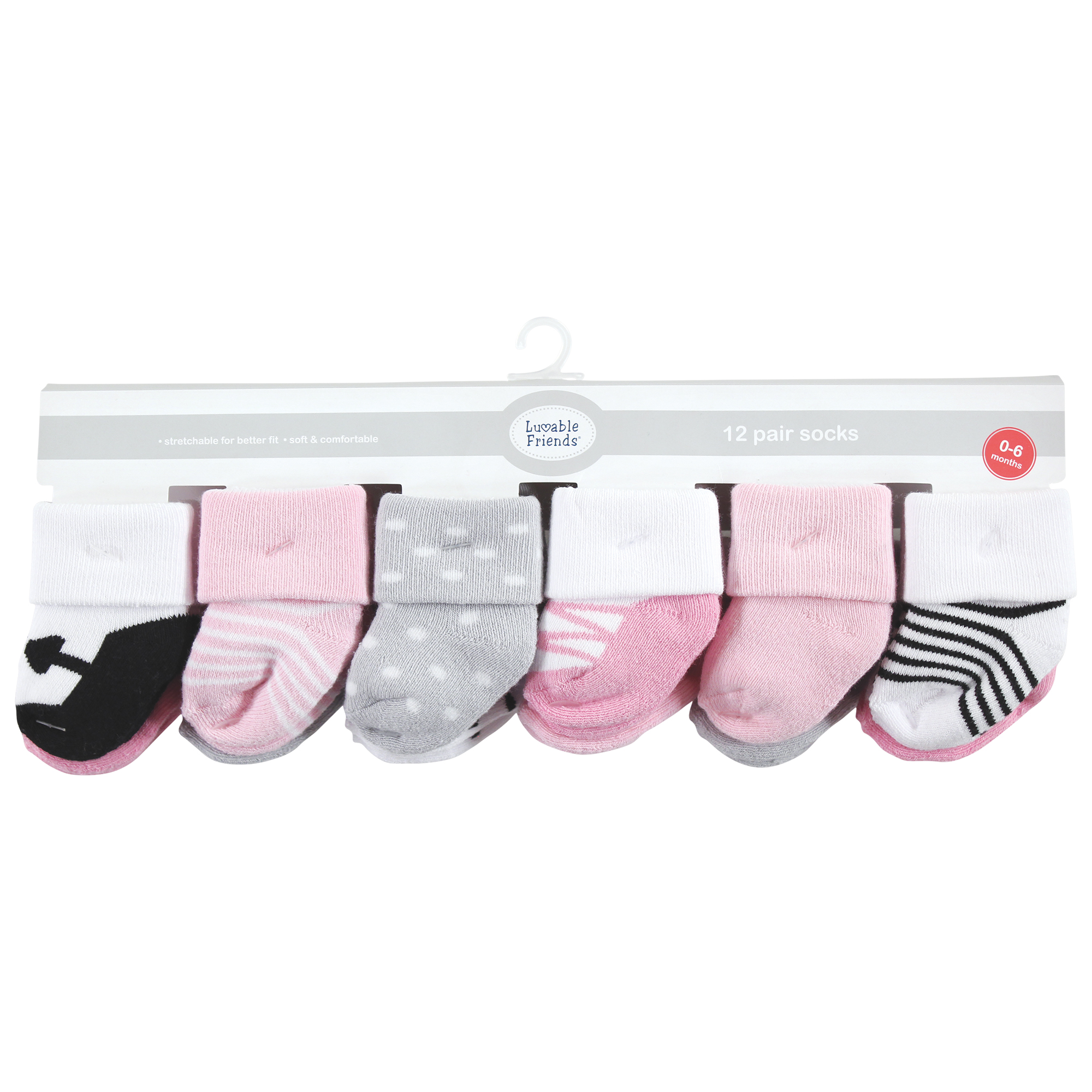 Luvable Friends Newborn and Baby Terry Socks, Pink Black Ballet 12-Pack