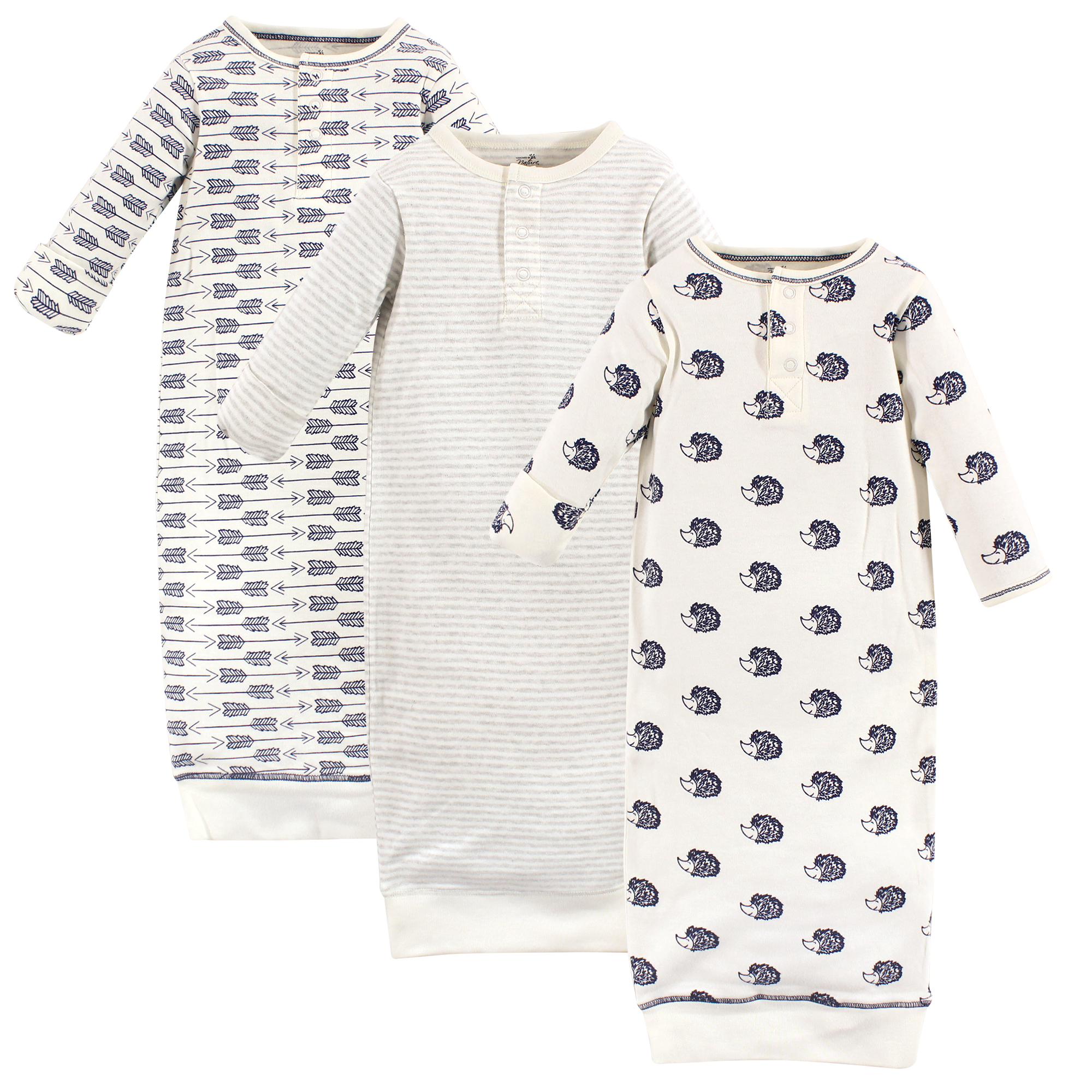Touched by Nature organic cotton henley gowns feature playful patterns for sweet dreams. Our organic fabric is super-soft and gentle on baby's skin, making sleep time cozy and comfortable. The henley construction with snaps makes for easy on and easy off, the elastic band at the bottom and a lap neck make dressing and diaper changes a breeze. Our preemie gowns are suitable for preemies and newborns from 6 to 9 pounds. Our 0-6 month gowns run a bit larger so they can last you up until your baby turns 6 months old. Our gowns are made of 100% cotton, so some shrinking should be expected. Touched by Nature is an organic cotton brand, focused on developing products made from premium organic cotton fabrics. Organic cotton feels super soft on skin as the fibers are natural and breathable. Organic cotton is made without the use of synthetic pesticides and fertilizers, so it is an environmentally friendly alternative compared to traditional farming methods.