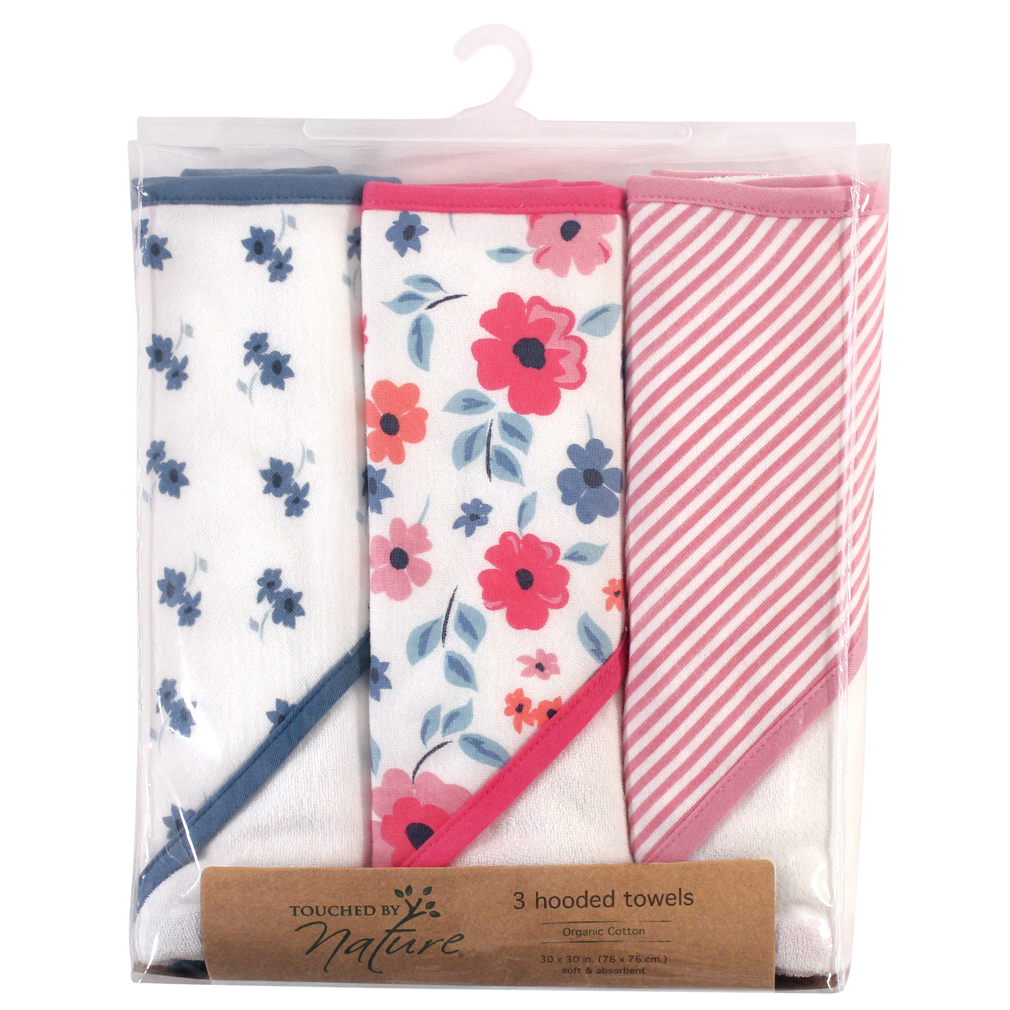 Touched by Nature organic cotton hooded towels feature three hooded towels made of 100% organic cotton. Our organic cotton fabric is soft, comfortable and cozy for your little one after bath time. Our prints and patterns will make your little one's bath time fun and colorful. Touched by Nature is an organic cotton brand, focused on developing products made from premium organic cotton fabrics. Organic cotton feels super soft on skin as the fibers are natural and breathable. Organic cotton is made without the use of synthetic pesticides and fertilizers, so it is an environmentally friendly alternative compared to traditional farming methods.