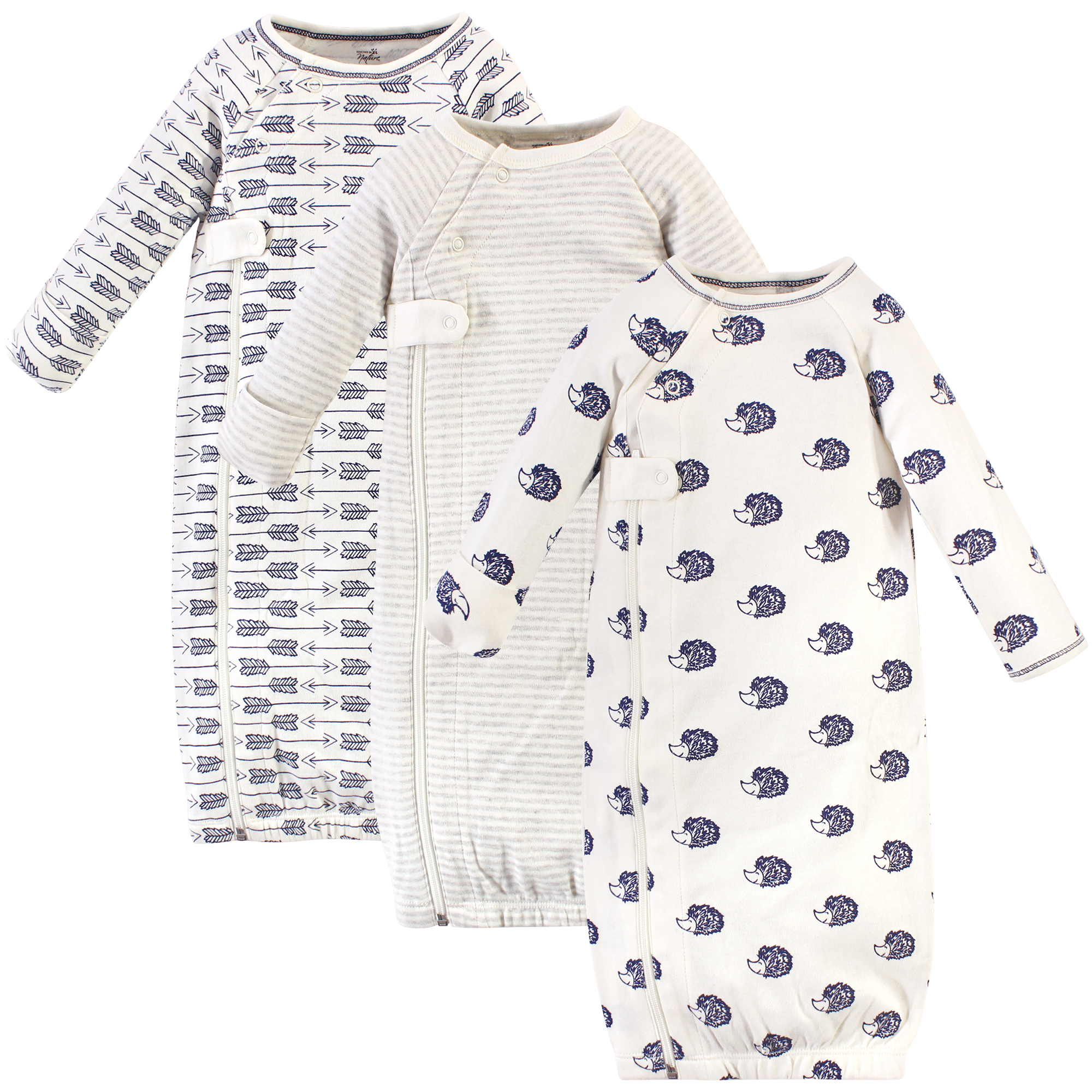 Touched by Nature organic cotton zipper gowns feature playful patterns for sweet dreams. Our organic fabric is super-soft and gentle on baby's skin, making sleep time cozy and comfortable. The zipper makes for easy on and easy off, the elastic band at the bottom and a lap neck make dressing and diaper changes a breeze. Our preemie gowns are suitable for preemies and newborns from 6 to 9 pounds. Our 0-6 month gowns run a bit larger so they can last you up until your baby turns 6 months old. Our gowns are made of 100% cotton, so some shrinking should be expected. Touched by Nature is an organic cotton brand, focused on developing products made from premium organic cotton fabrics. Organic cotton feels super soft on skin as the fibers are natural and breathable. Organic cotton is made without the use of synthetic pesticides and fertilizers, so it is an environmentally friendly alternative compared to traditional farming methods.