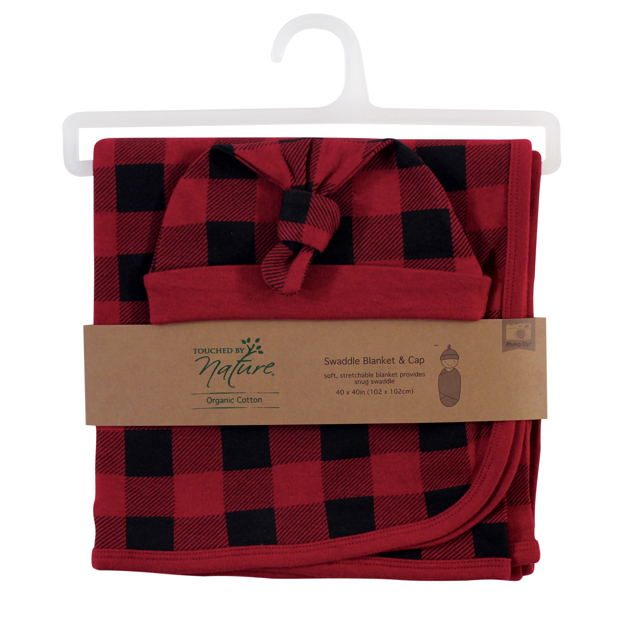 Touched by Nature Organic Cotton Swaddle Blanket and Headband or Cap, Buffalo Plaid