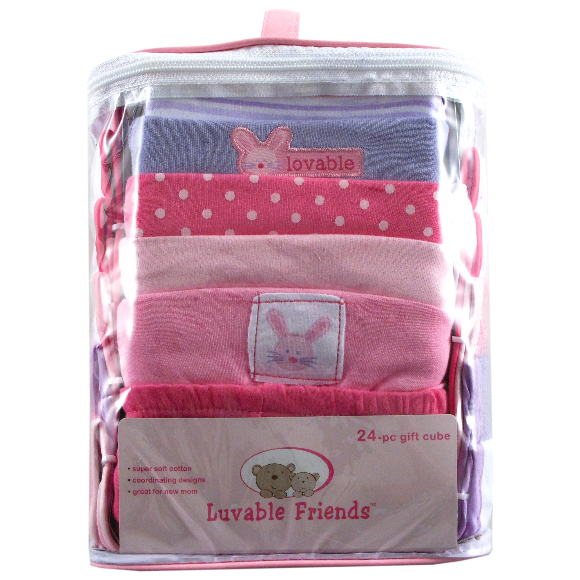 Luvable Friends 24-piece gift cubes feature all your baby essential needs in one easy to purchase baby package. All pieces in the gift cube are designed to coordinate together to make dressing your little one fun, convenient and easy. Our gift cubes make a great baby shower gift.