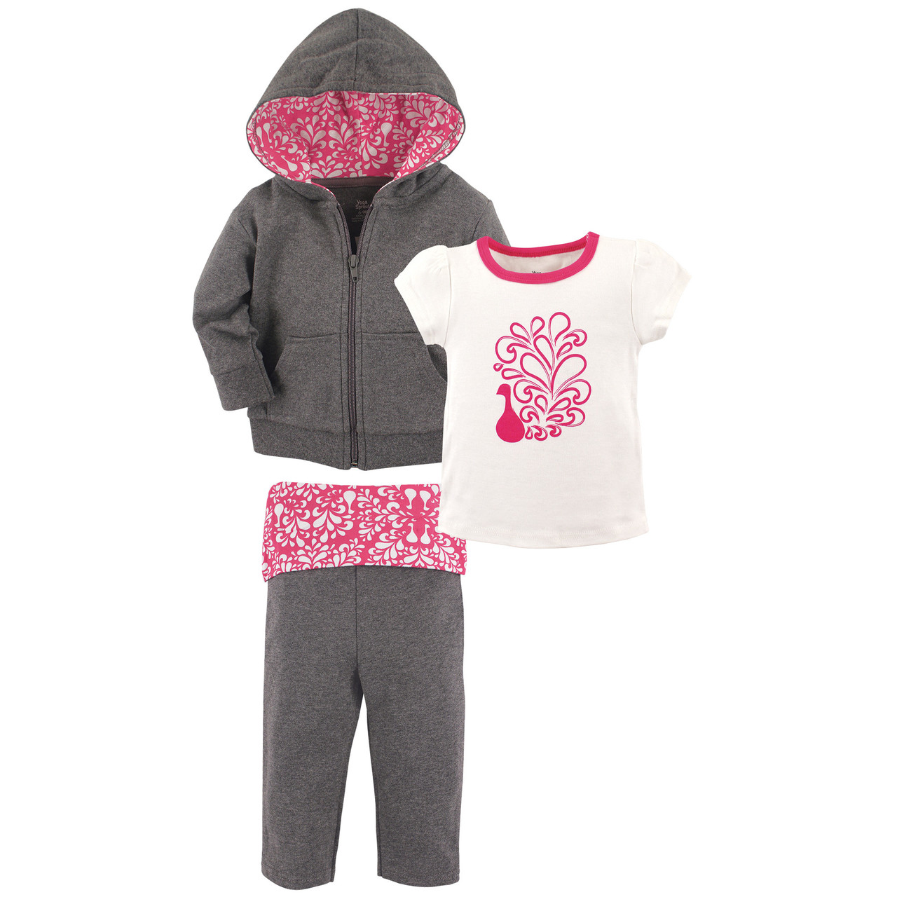 Yoga Sprout features fun, comfortable athletic wear with vibrant colors and playful patterns. This adorable hoodie/jacket, bodysuit or tee top and pant set features soft, stretchable, 100 percent cotton fabric that is sure to keep up with your active little sprout. Girl's pants are made of 92% Cotton and 8% Spandex. From happy baby pose to every day adventures, grow, relax and be happy, with Yoga Sprout