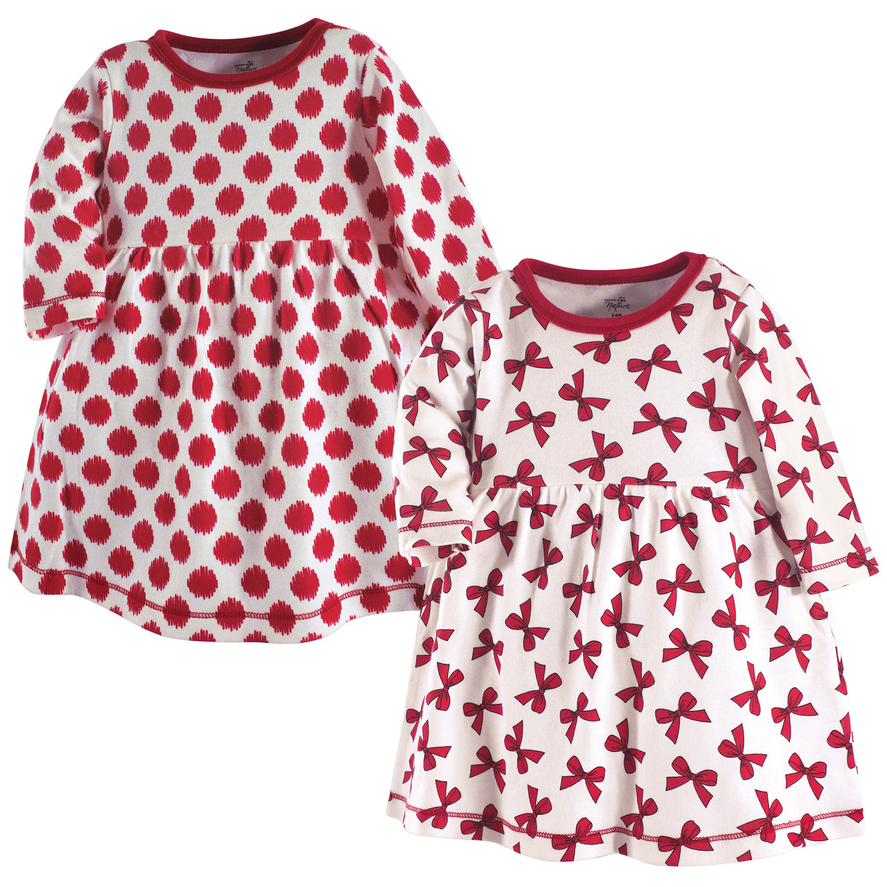 Touched by Nature is a 100 percent organic baby clothing brand made of premium organic cotton fabric and features beautifully designed clothing, bibs, blankets, hair accessories and socks. Organic cotton feels super soft on baby's skin as the fibers are natural and breathable. Organic cotton is made without the use of synthetic pesticides and fertilizers, so it is an environmentally-friendly alternative compared to traditional farming methods. Touched by Nature organic cotton dress 2-pack is made of 100 percent organic interlock cotton (exclusive of decoration) and the perfect outfit for your little girl. Featuring adorable prints and stripes, our dresses are perfect outfits for special occasions because they are fashionable and comfortable for baby to wear. Our dresses are made of premium fabrics and the most convenient construction for easy on and easy off. Make dress time more fun with Touched by Nature dresses